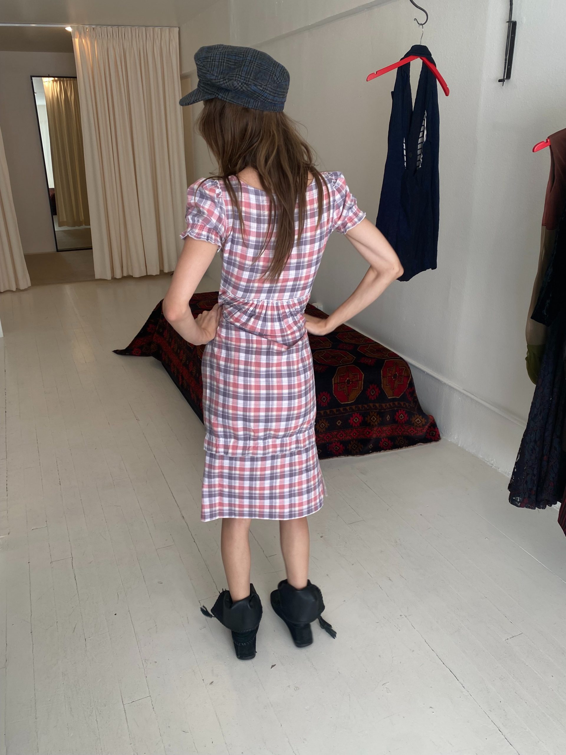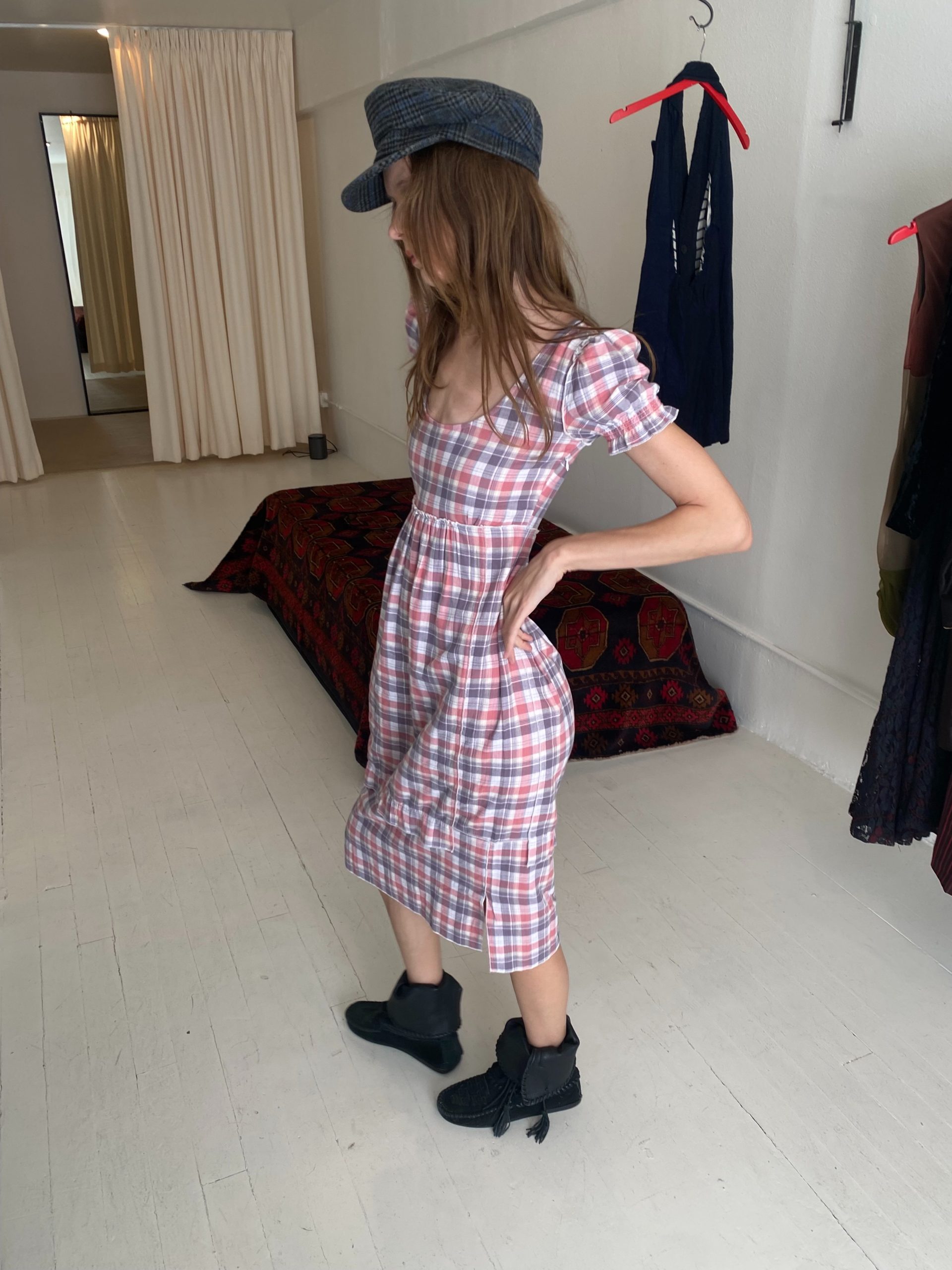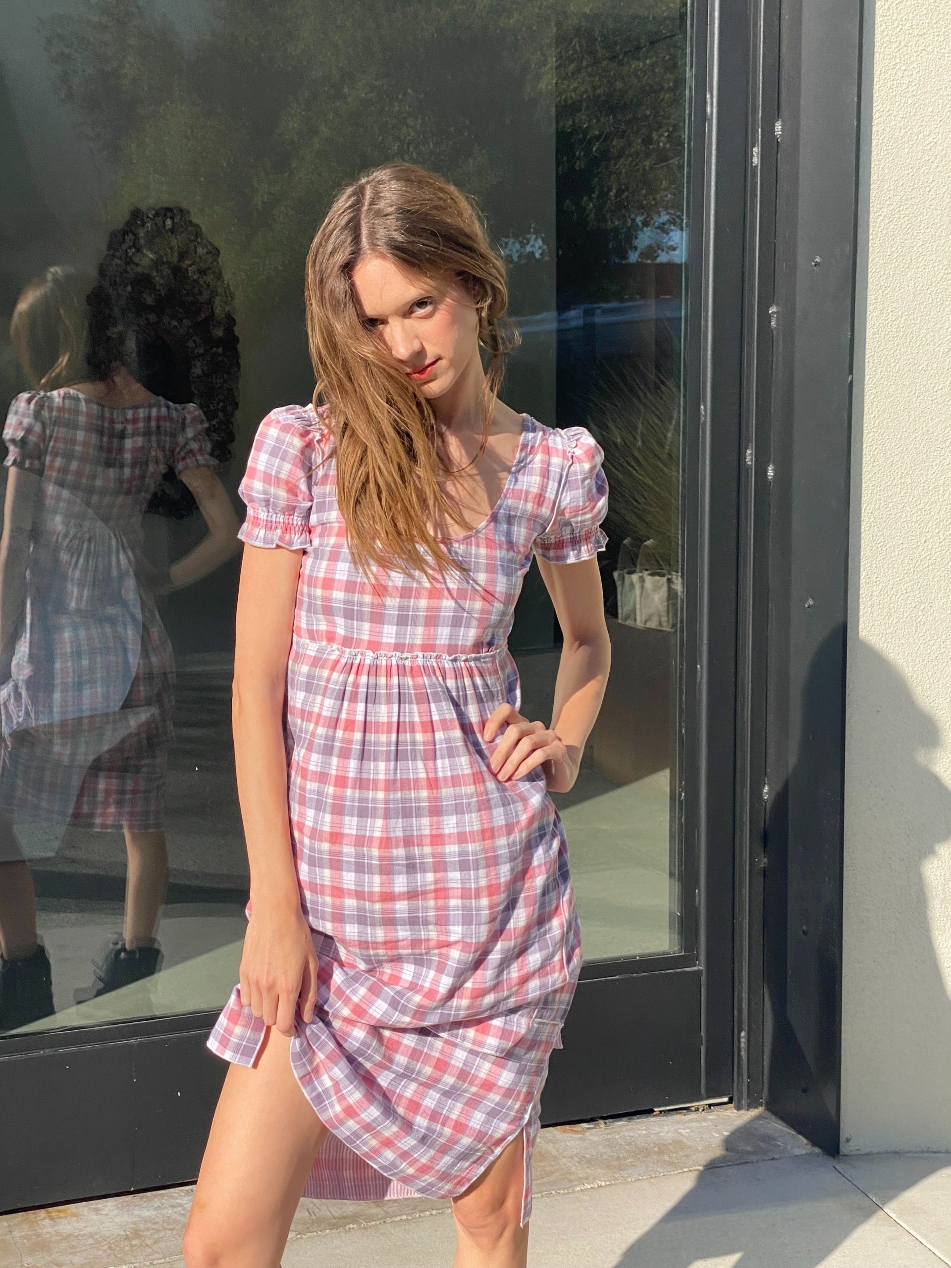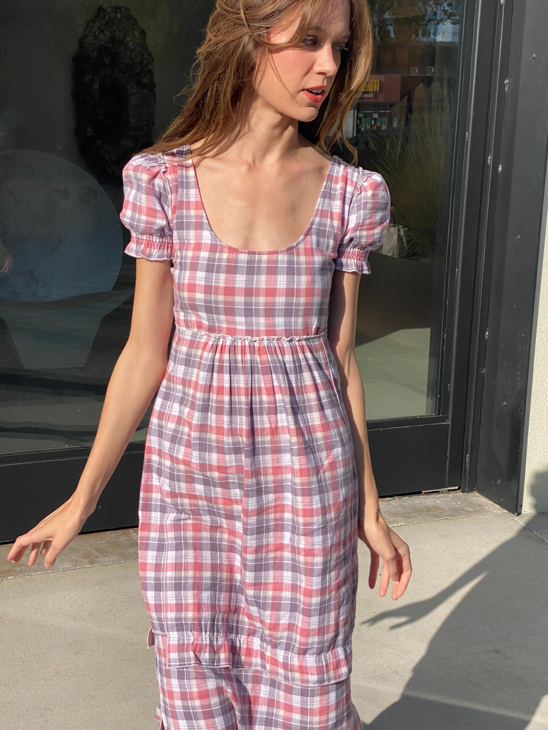 The Emilie dress is made from double-layered cotton. It features a pink and white plaid pattern, a fitted bodice with a scoop neckline, and short puff sleeves that add a touch of vintage charm. It's soft, breathable fabric gives it an effortless, cottagecore feel — casual yet feminine.