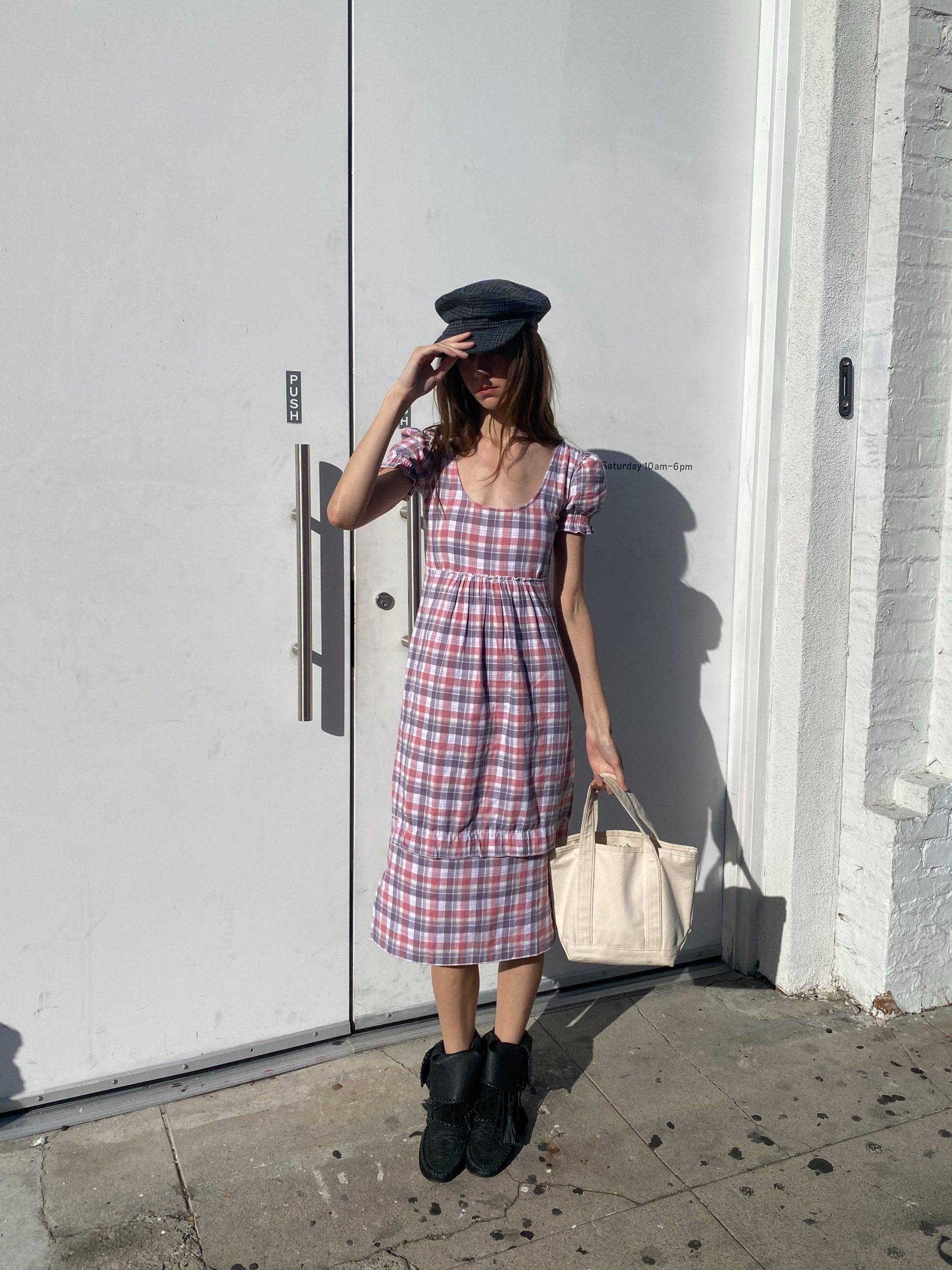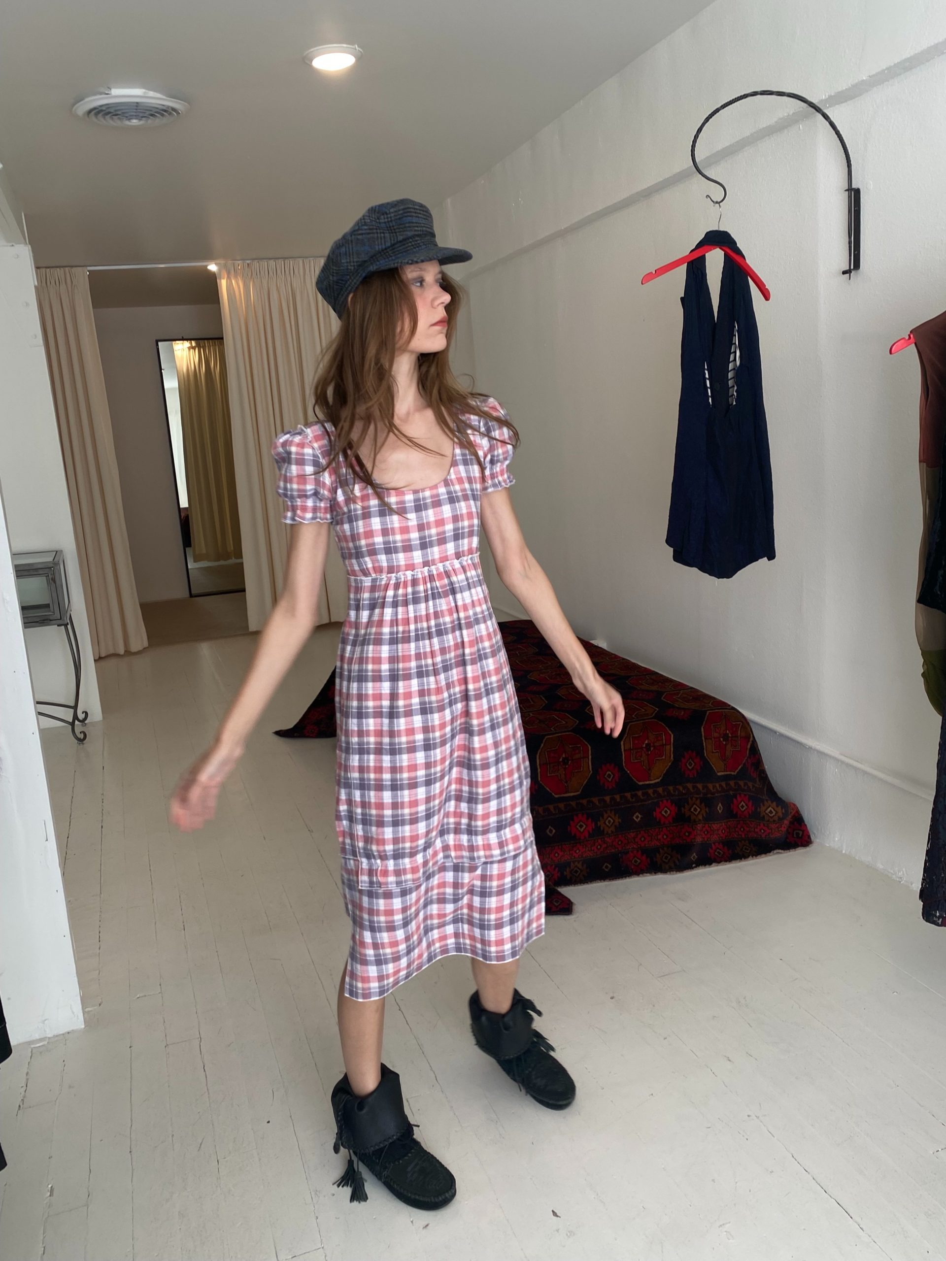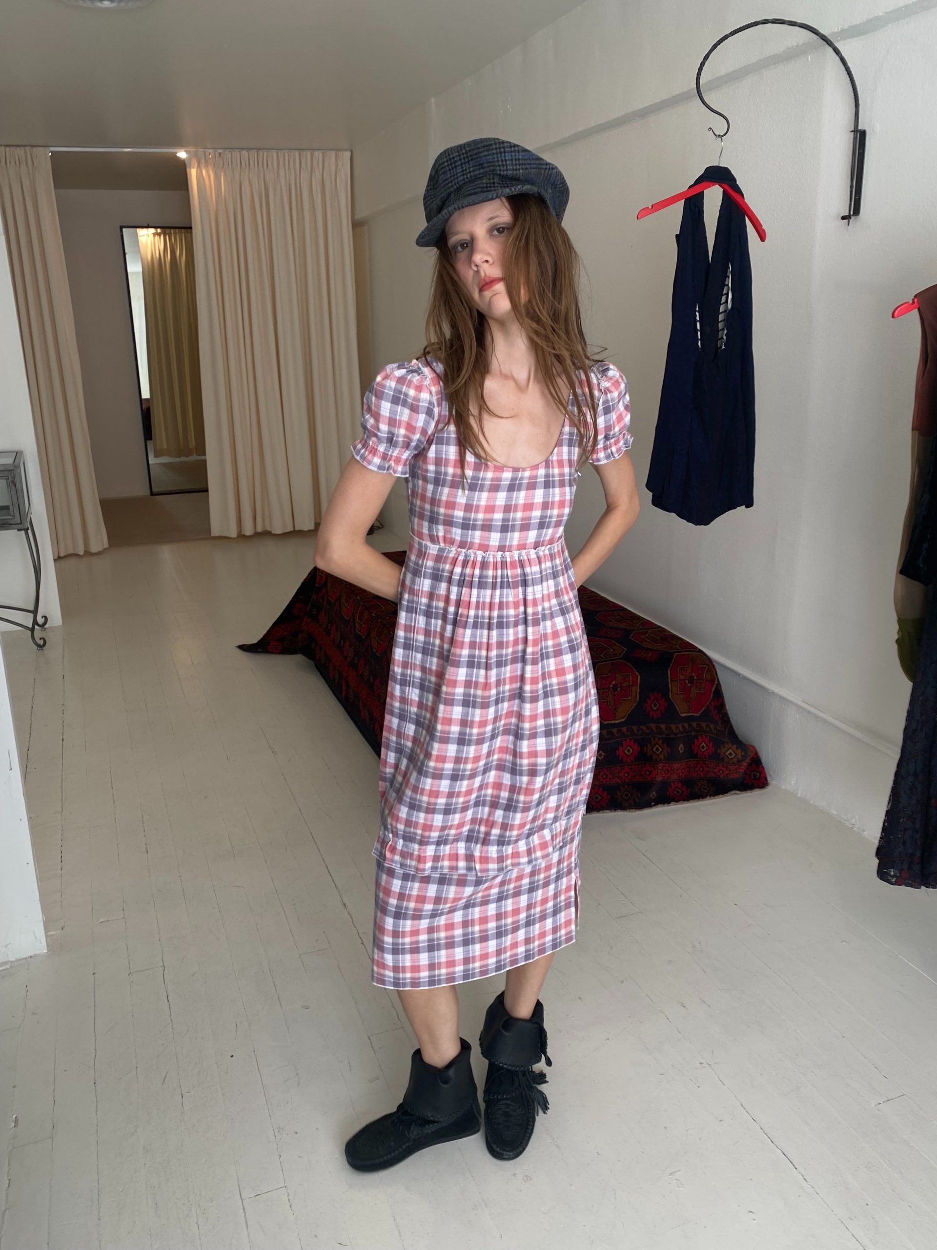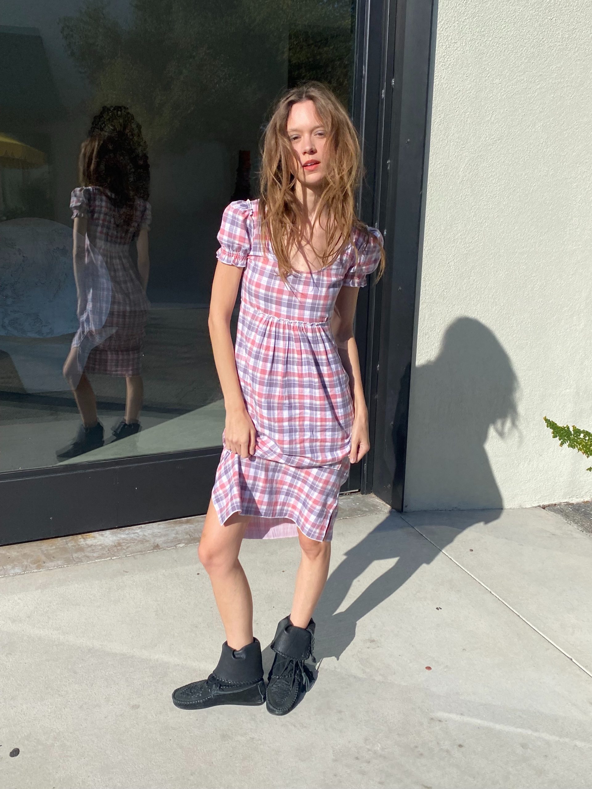 The Emilie dress is made from double-layered cotton. It features a pink and white plaid pattern, a fitted bodice with a scoop neckline, and short puff sleeves that add a touch of vintage charm. It's soft, breathable fabric gives it an effortless, cottagecore feel — casual yet feminine.