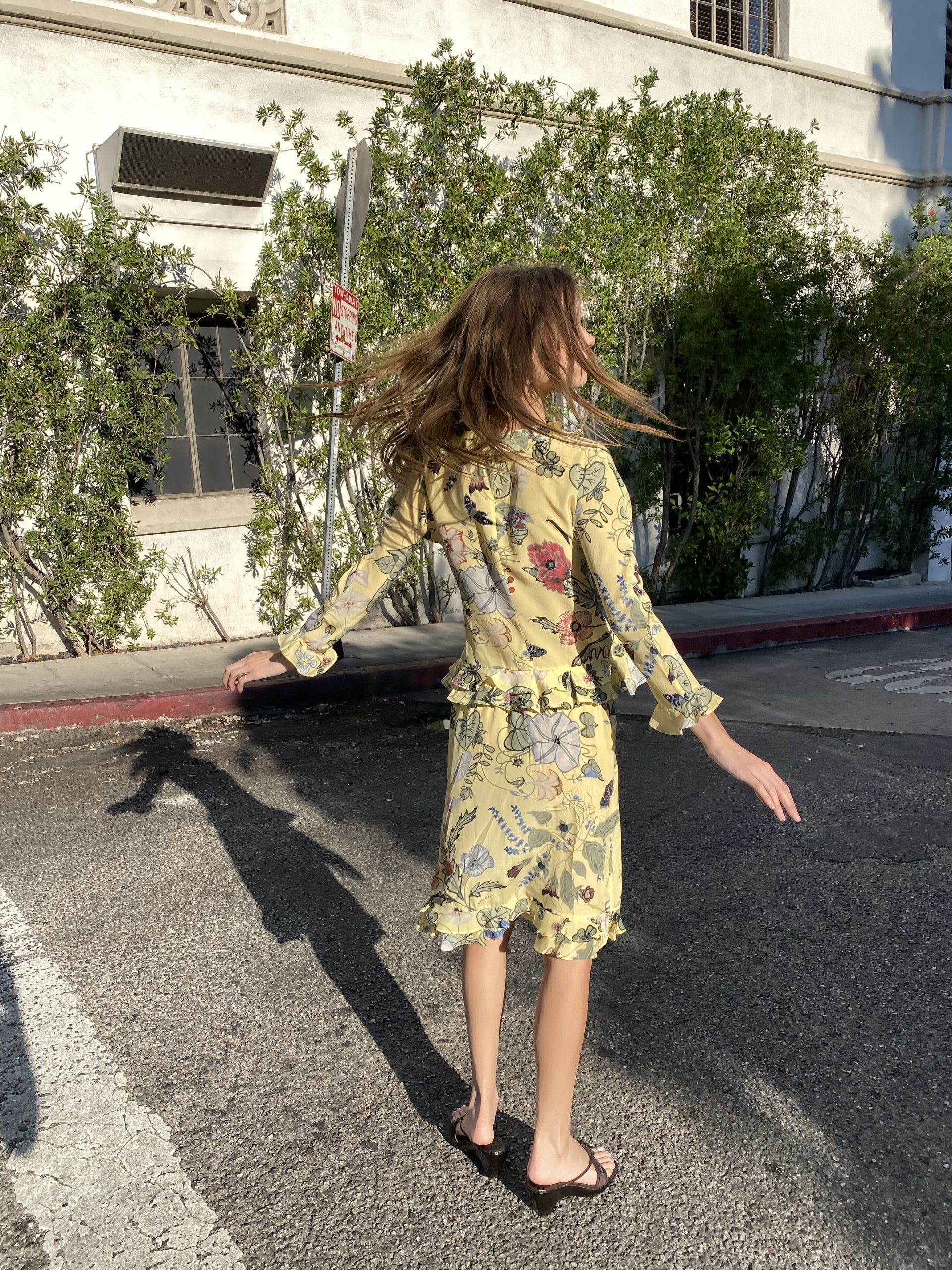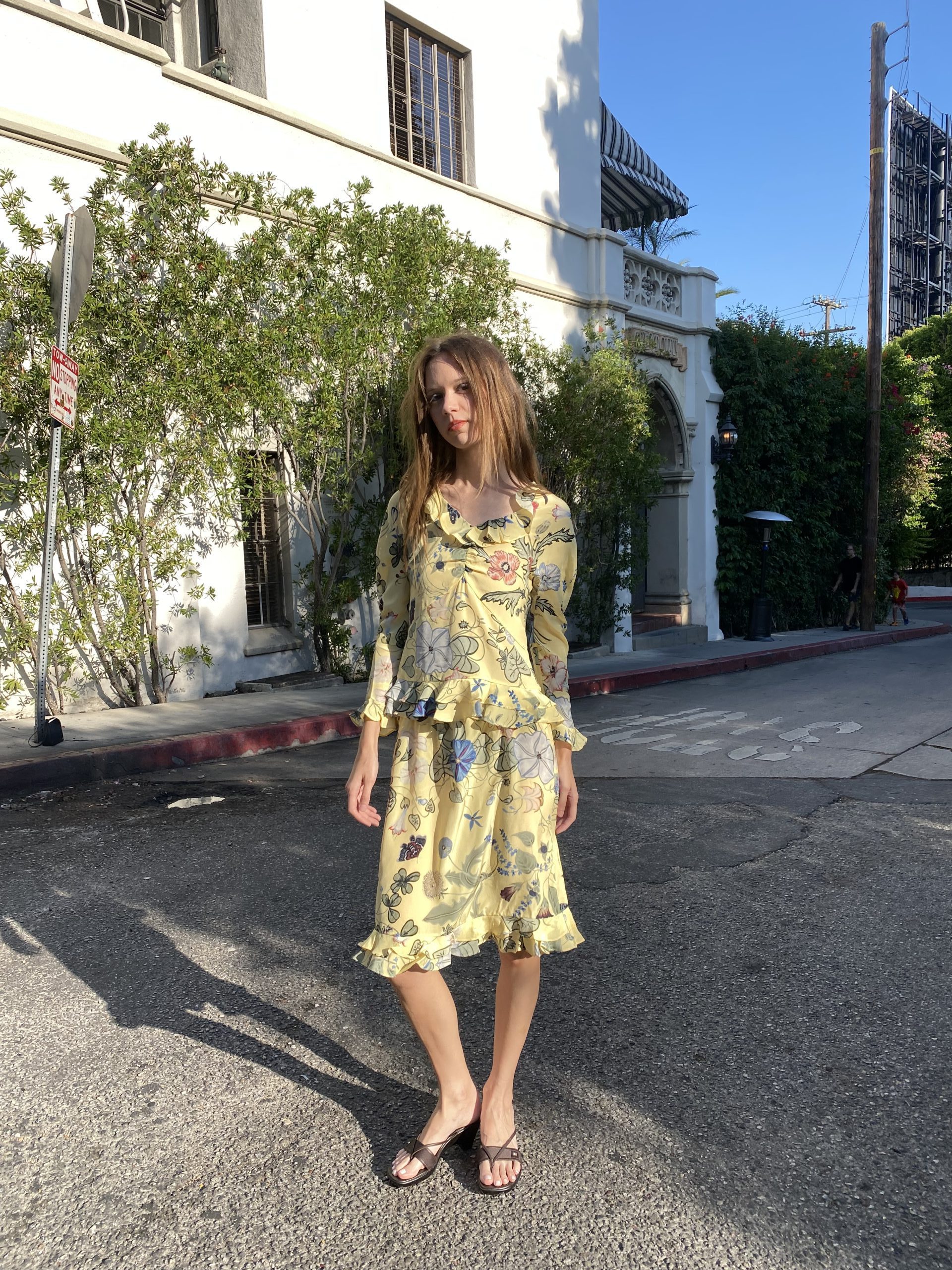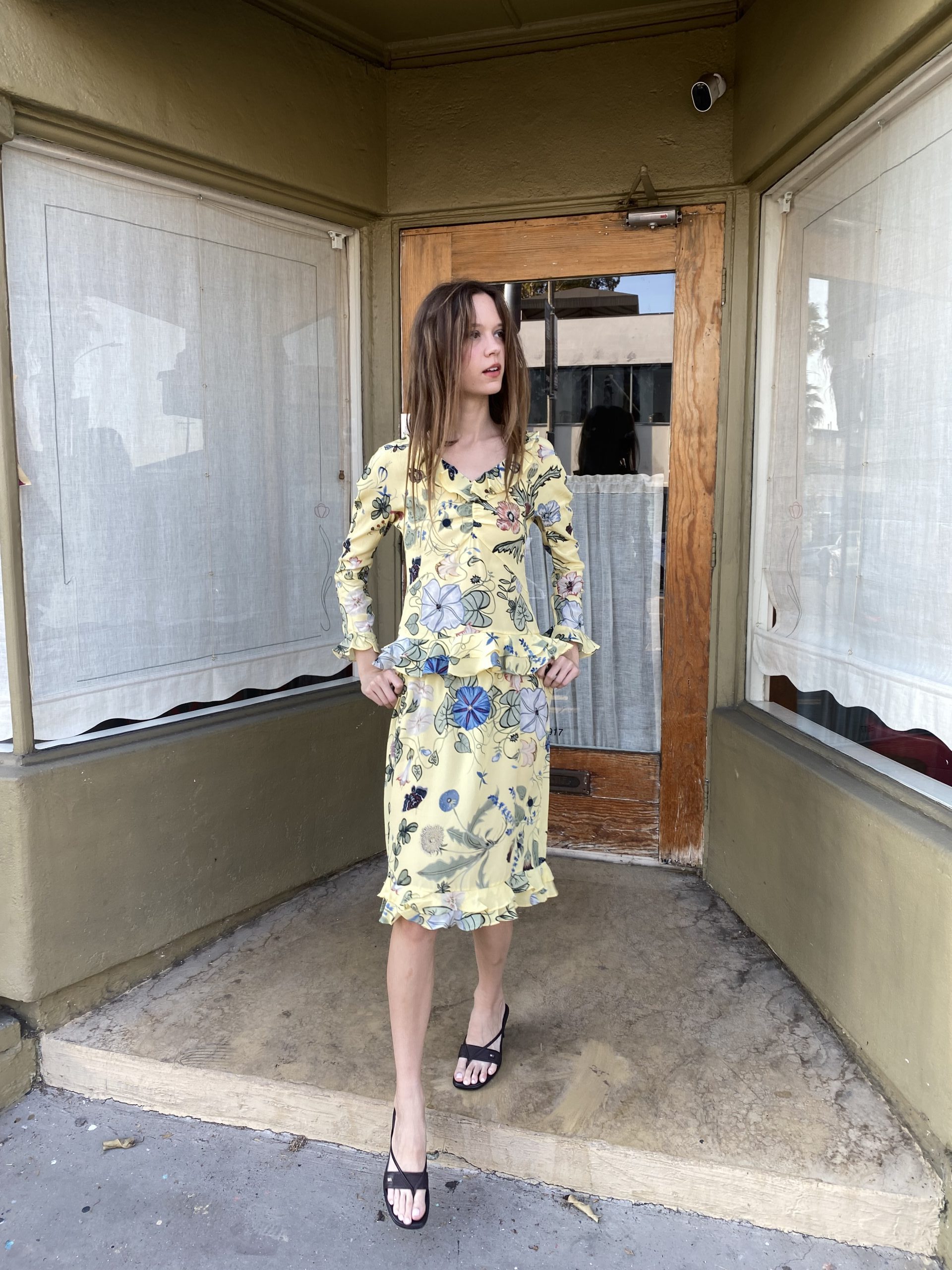 A soft yellow two-piece set adorned with delicate morning glory floral prints.