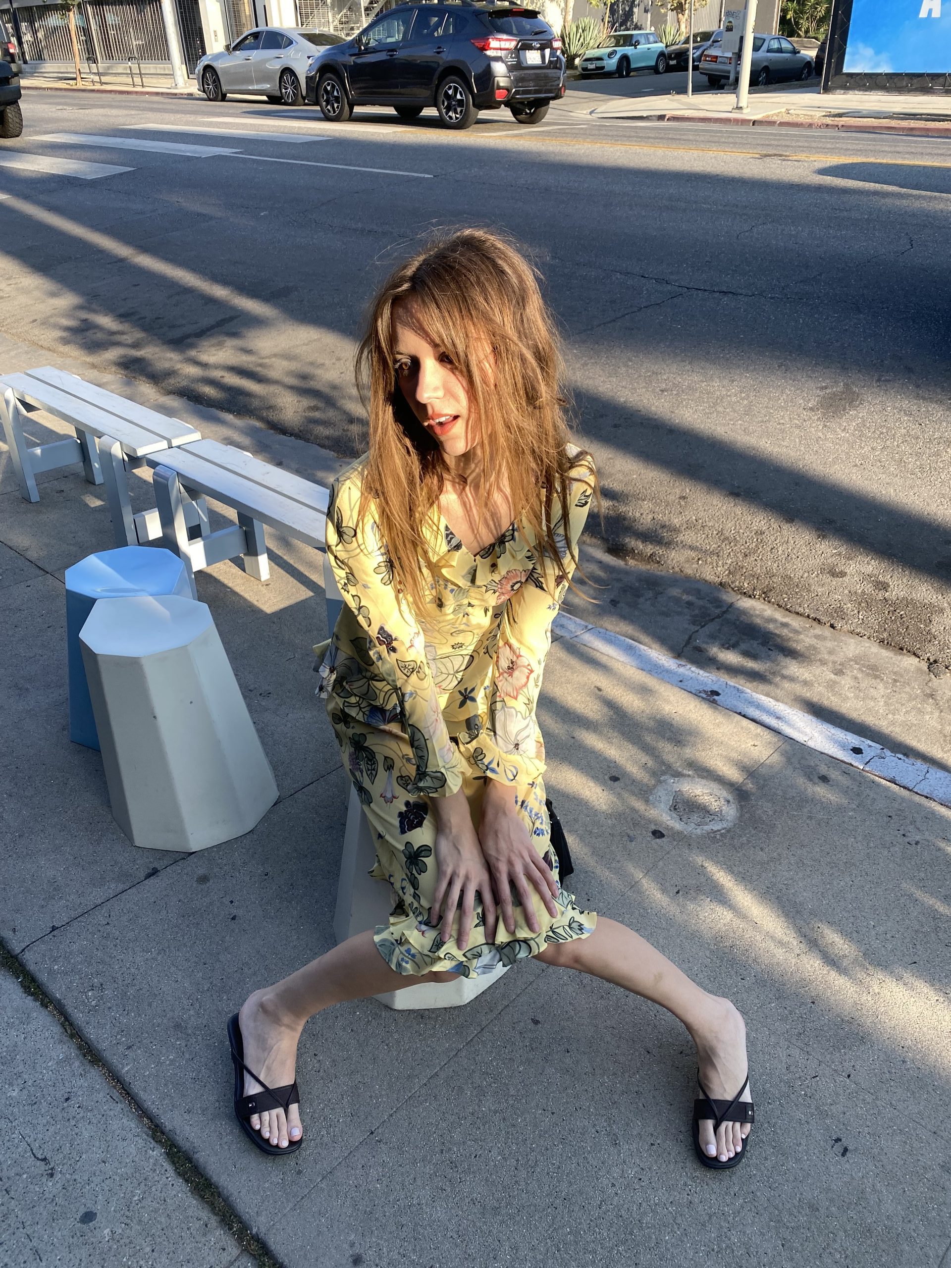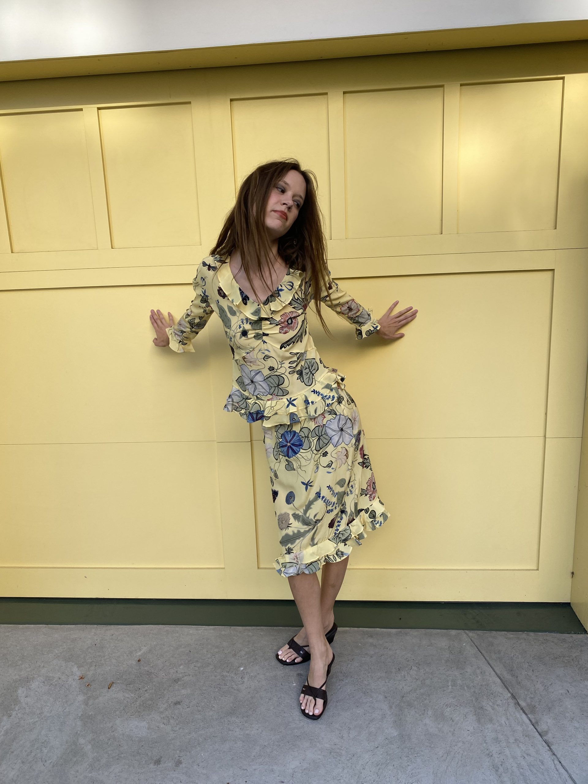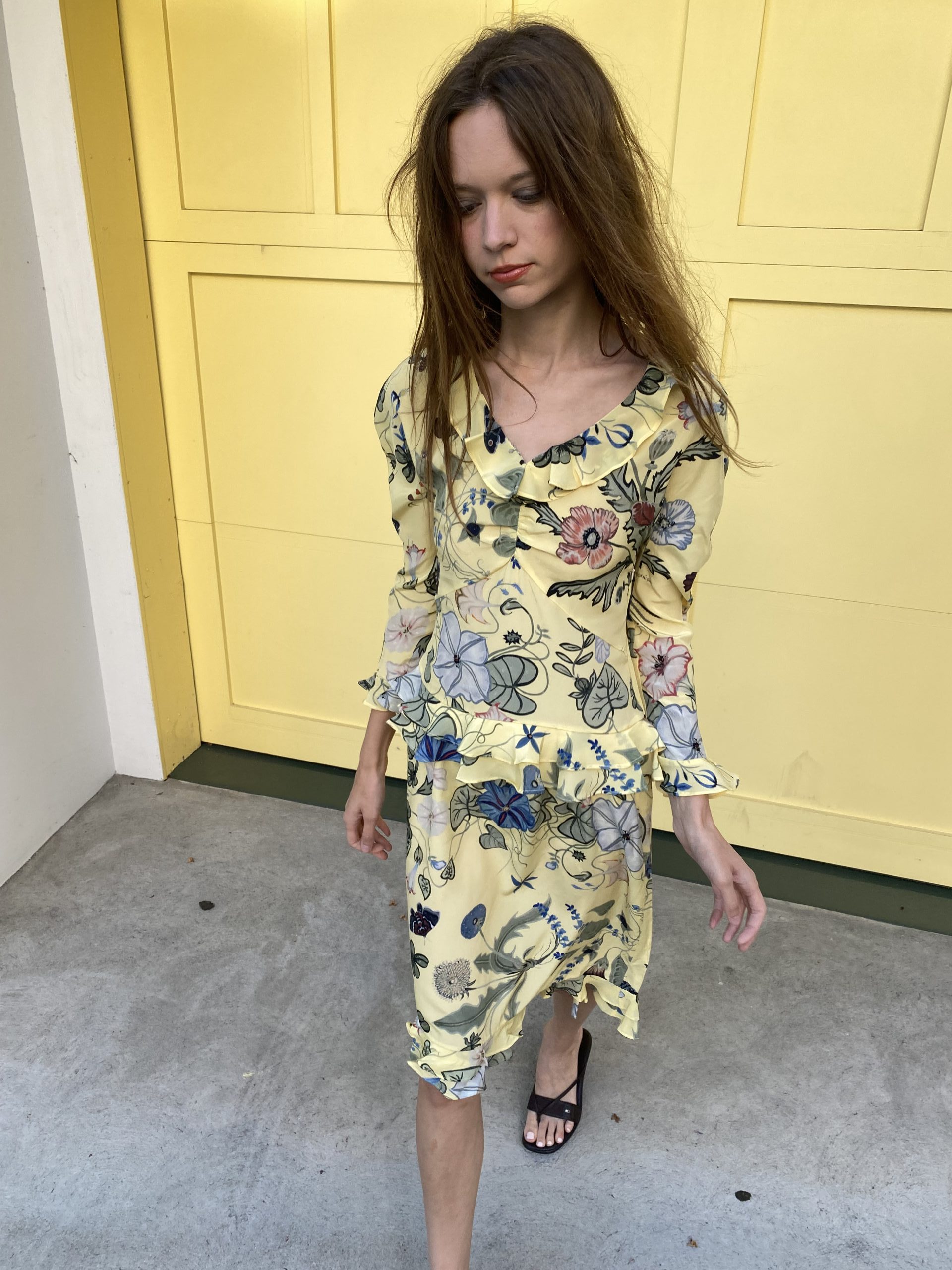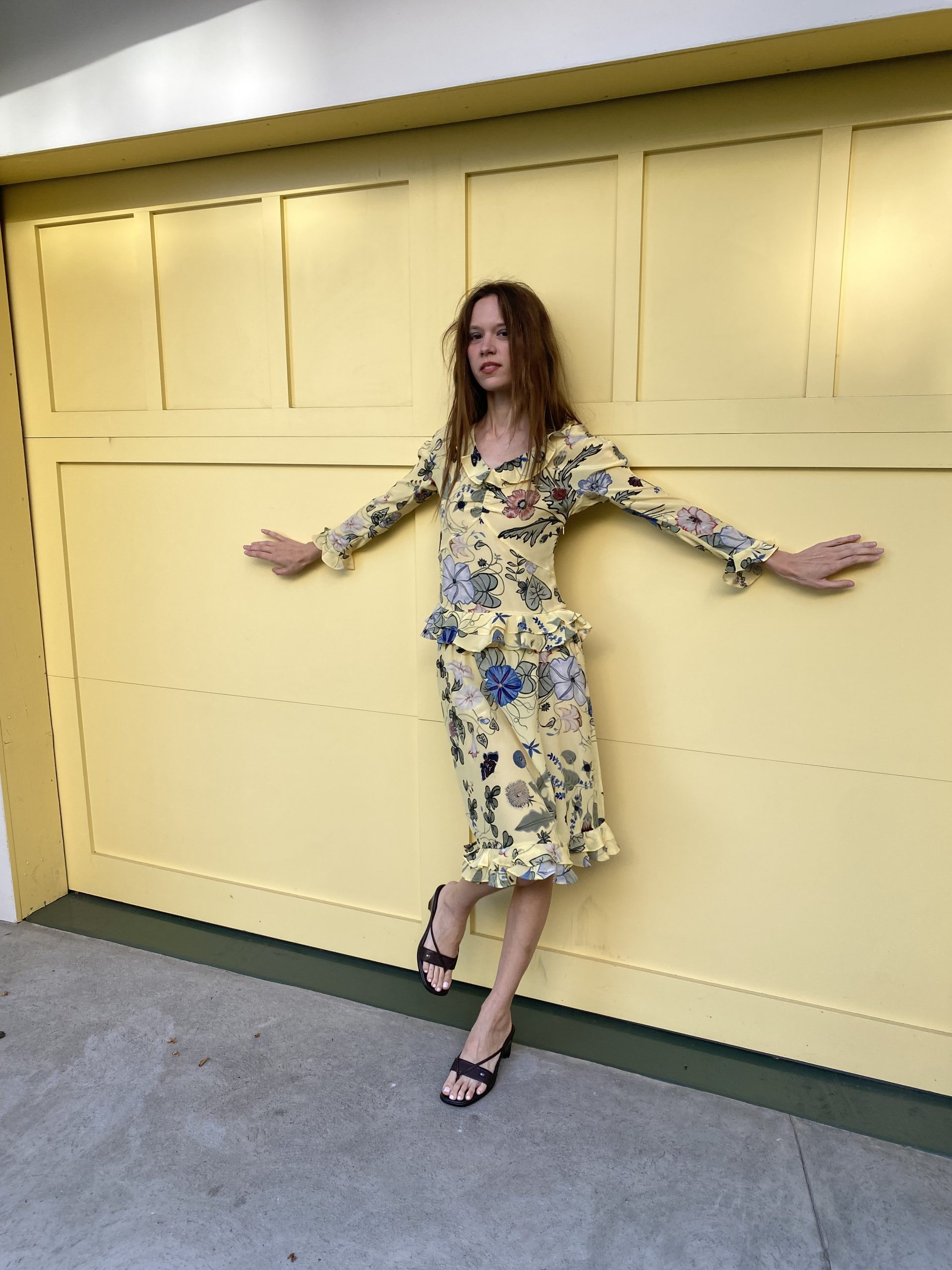 A soft yellow two-piece set adorned with delicate morning glory floral prints.