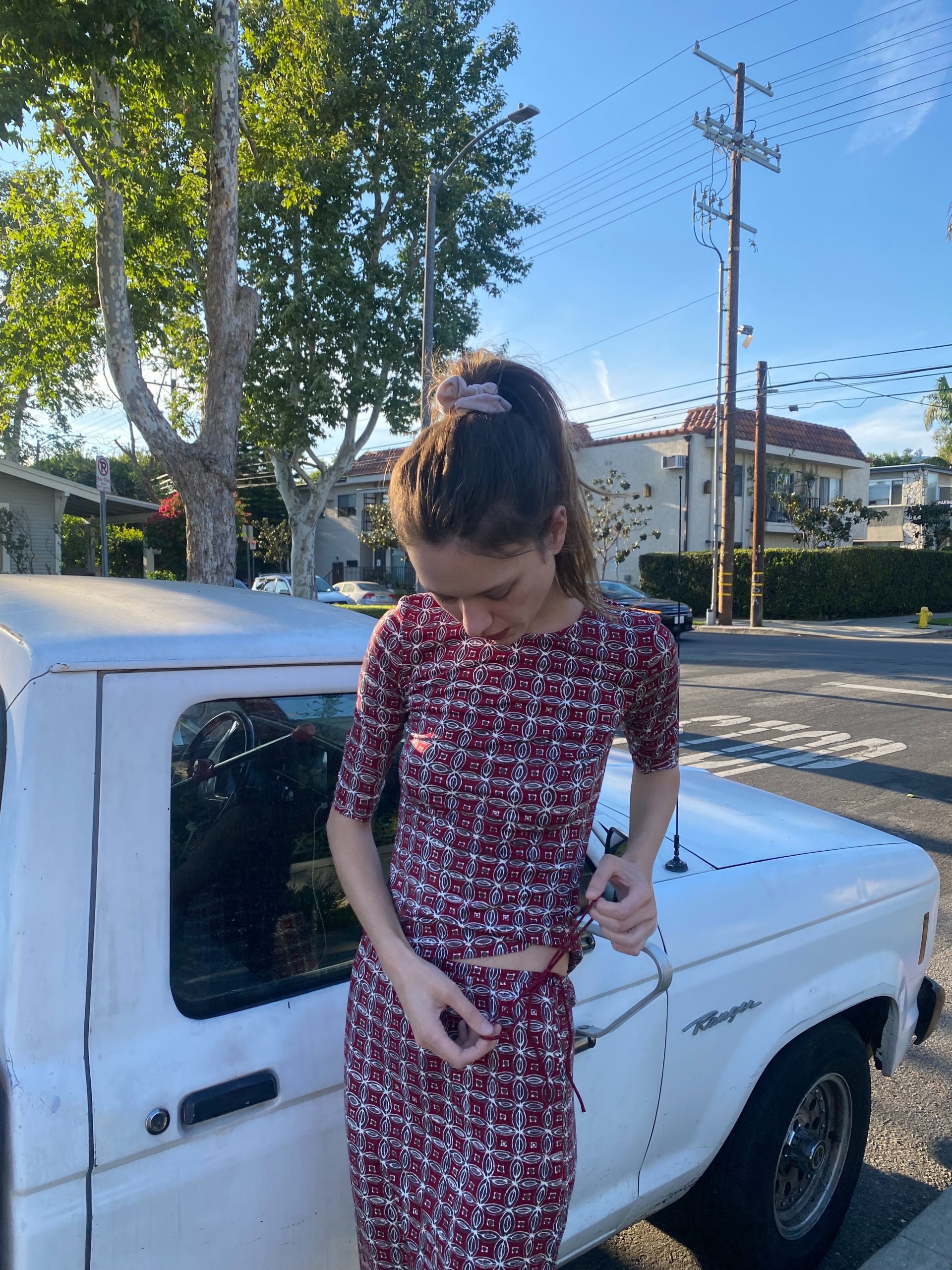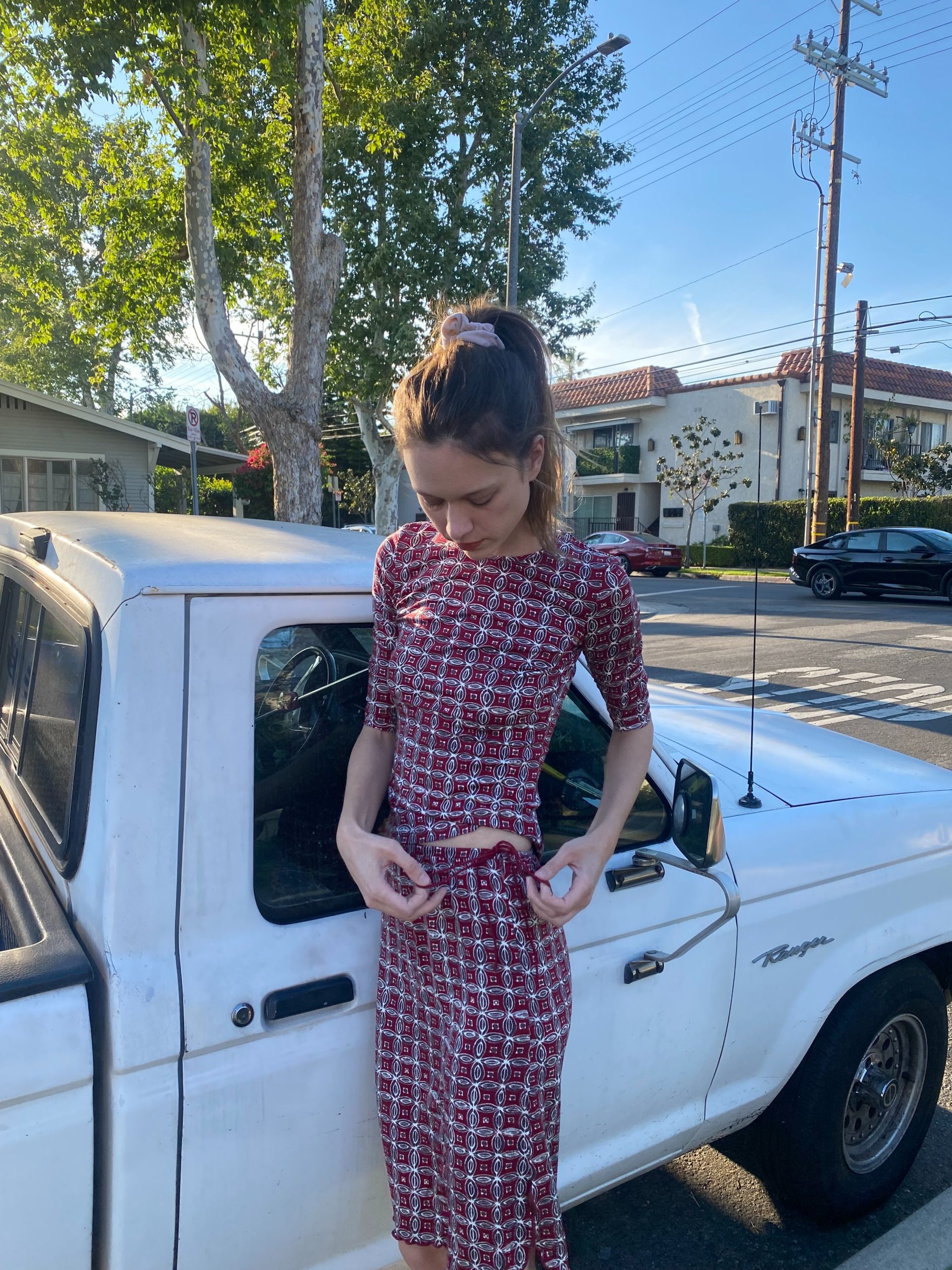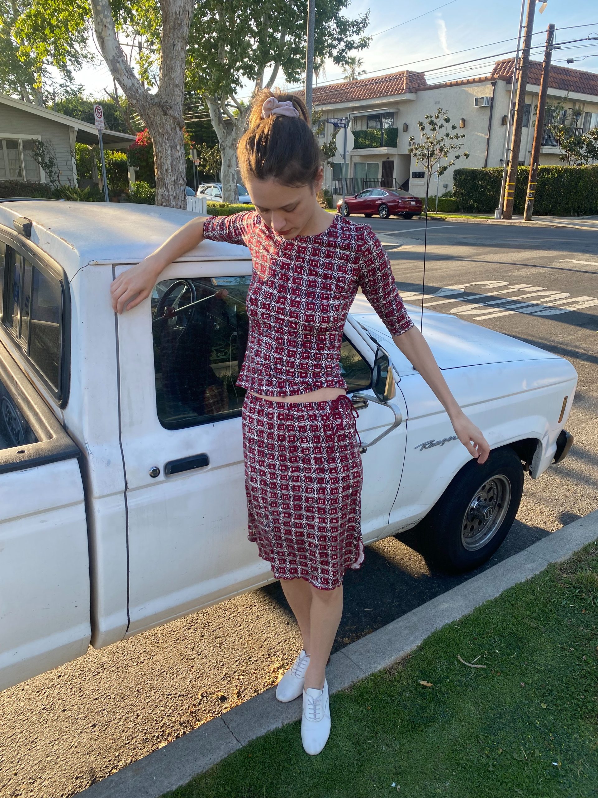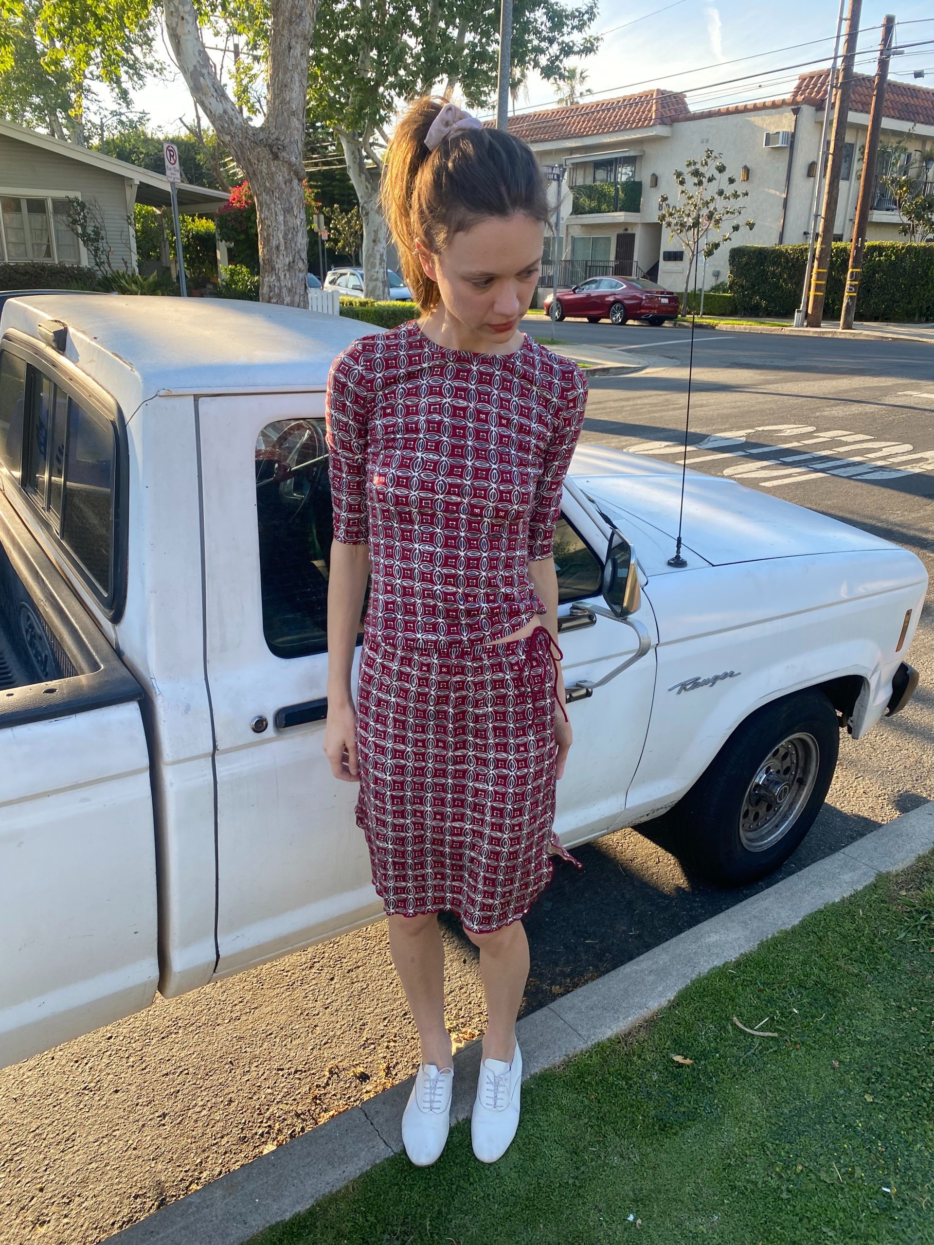 A fitted jersey two-piece in deep red with a geometric micro print.