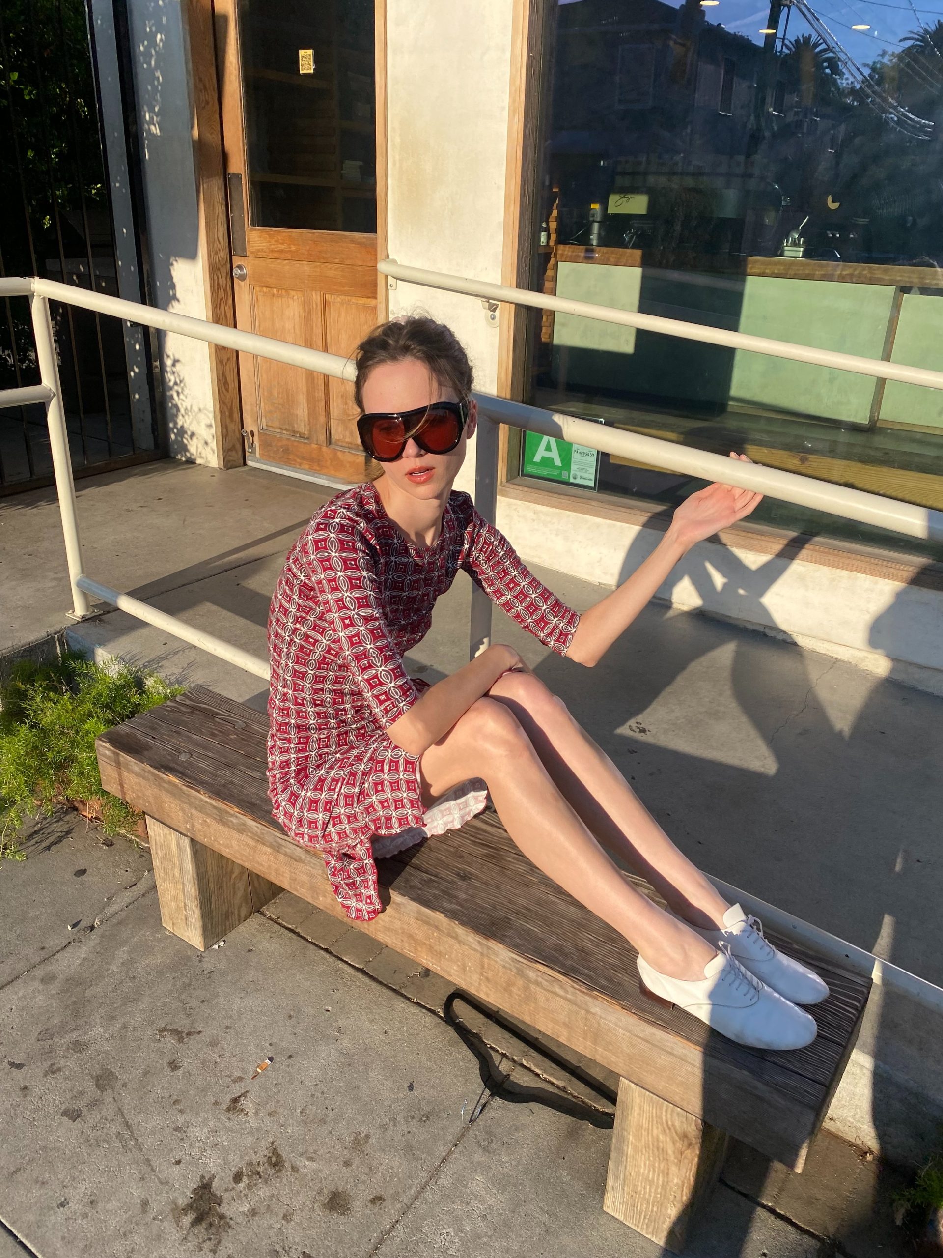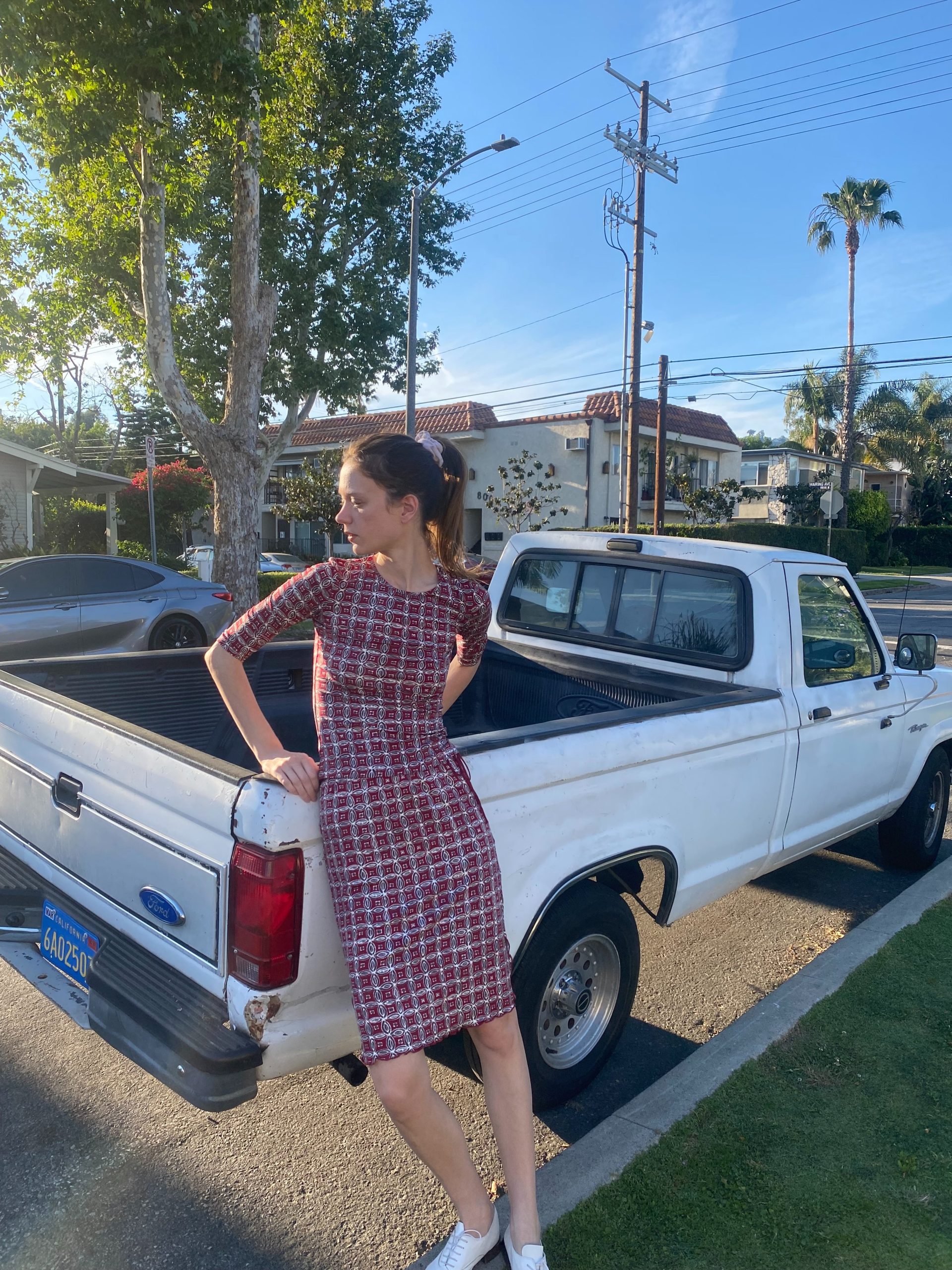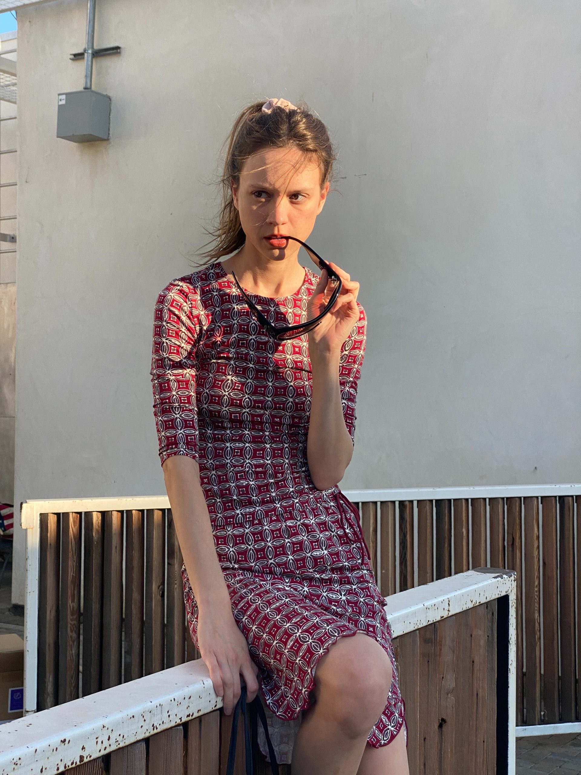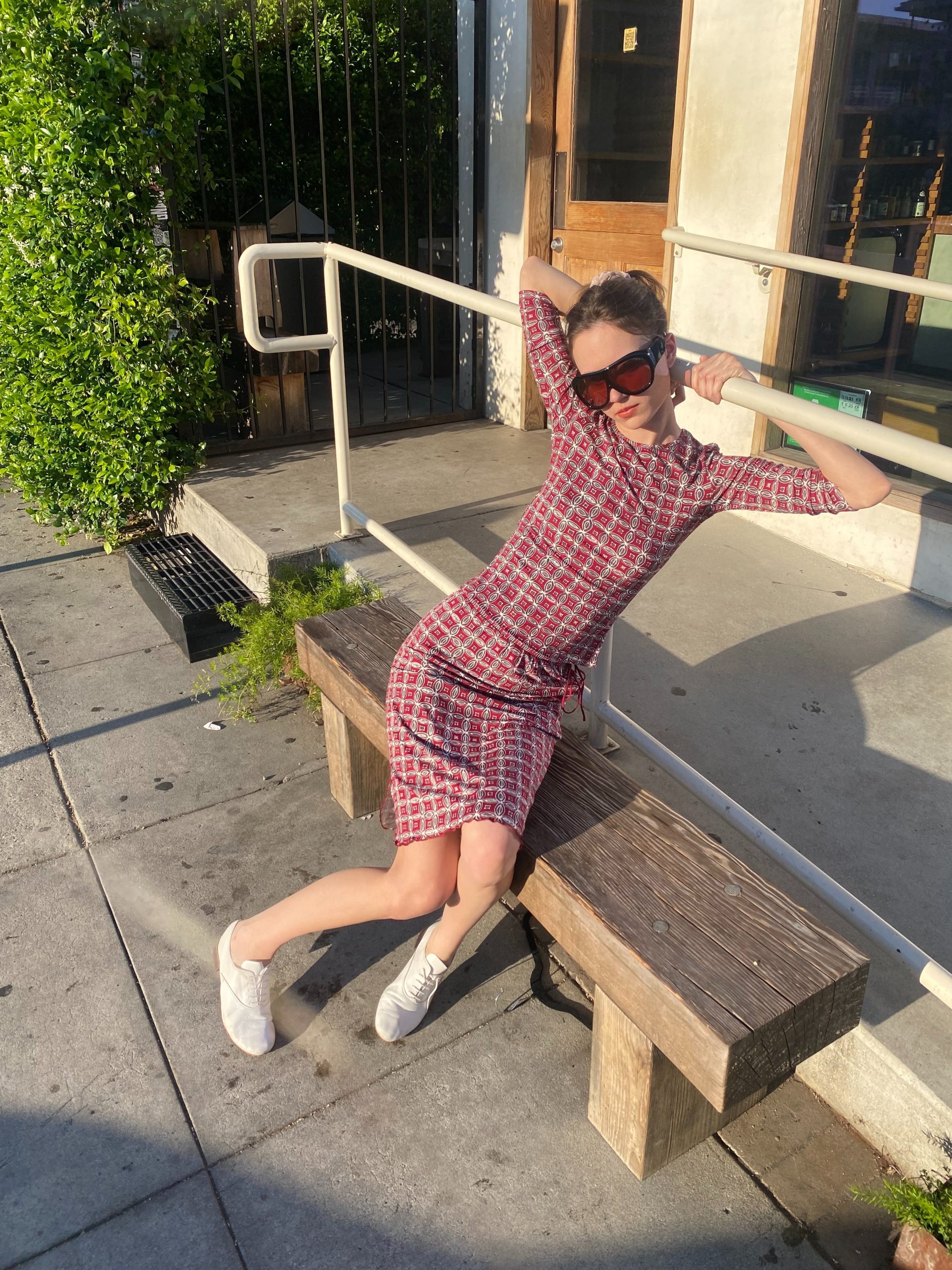 A fitted jersey two-piece in deep red with a geometric micro print.