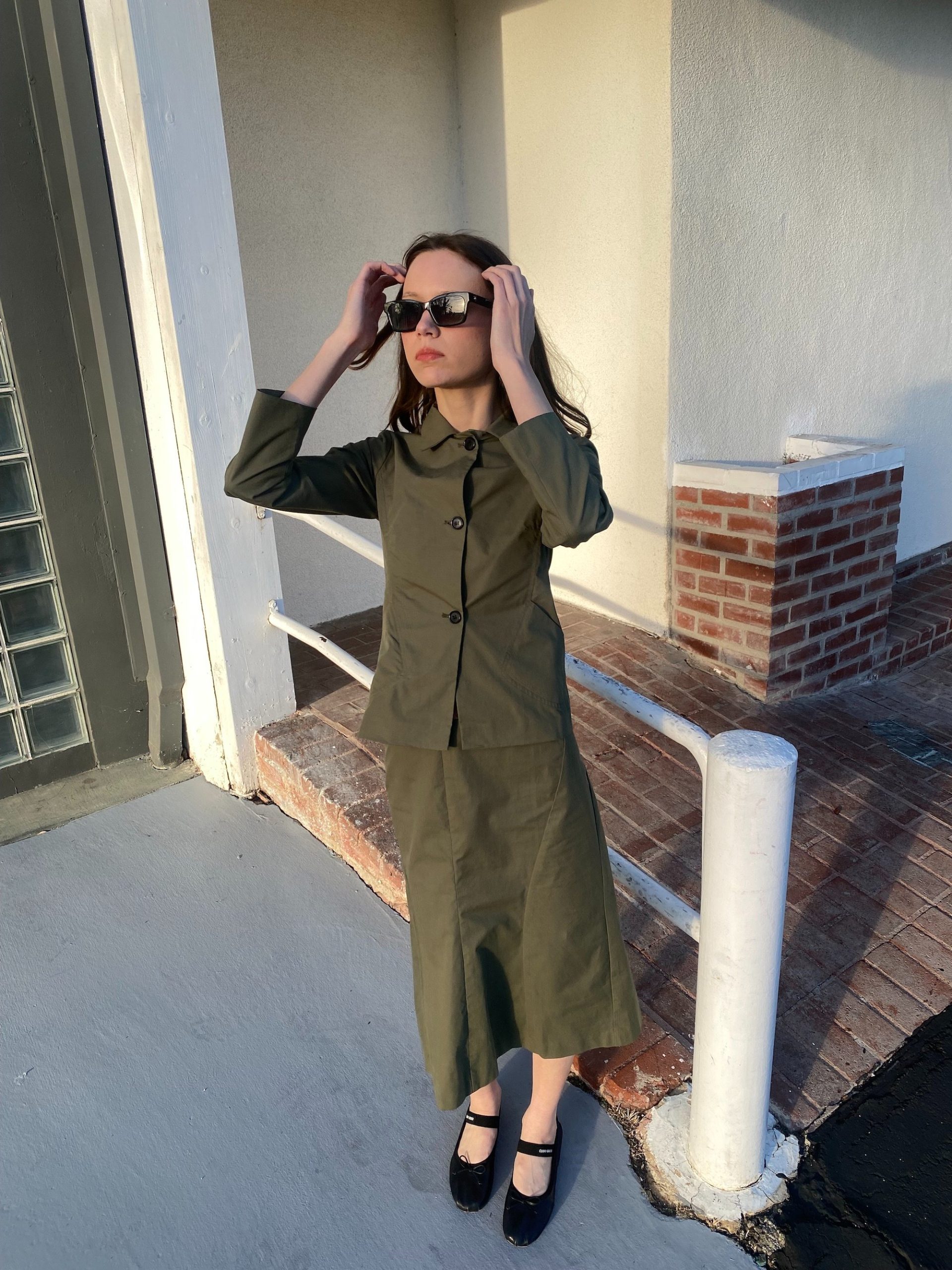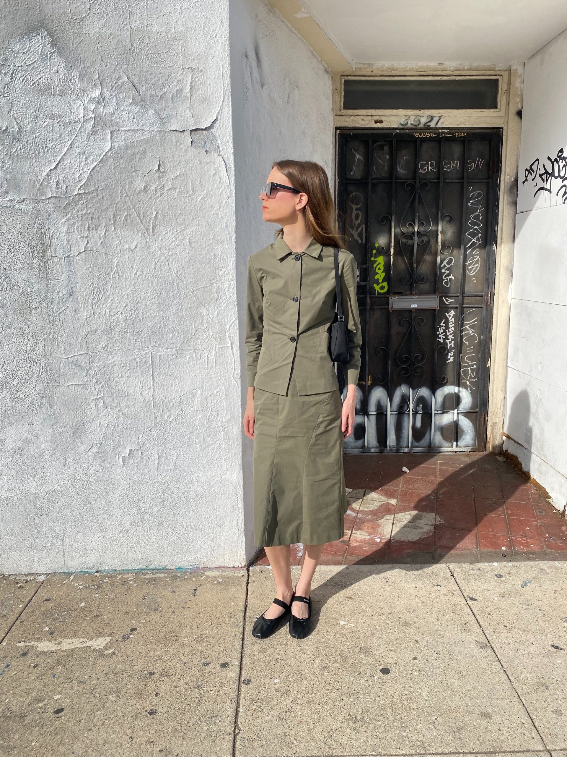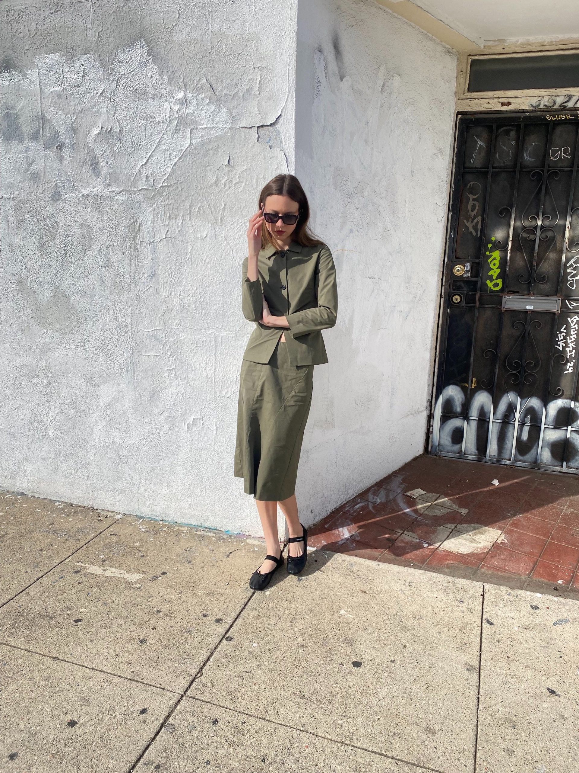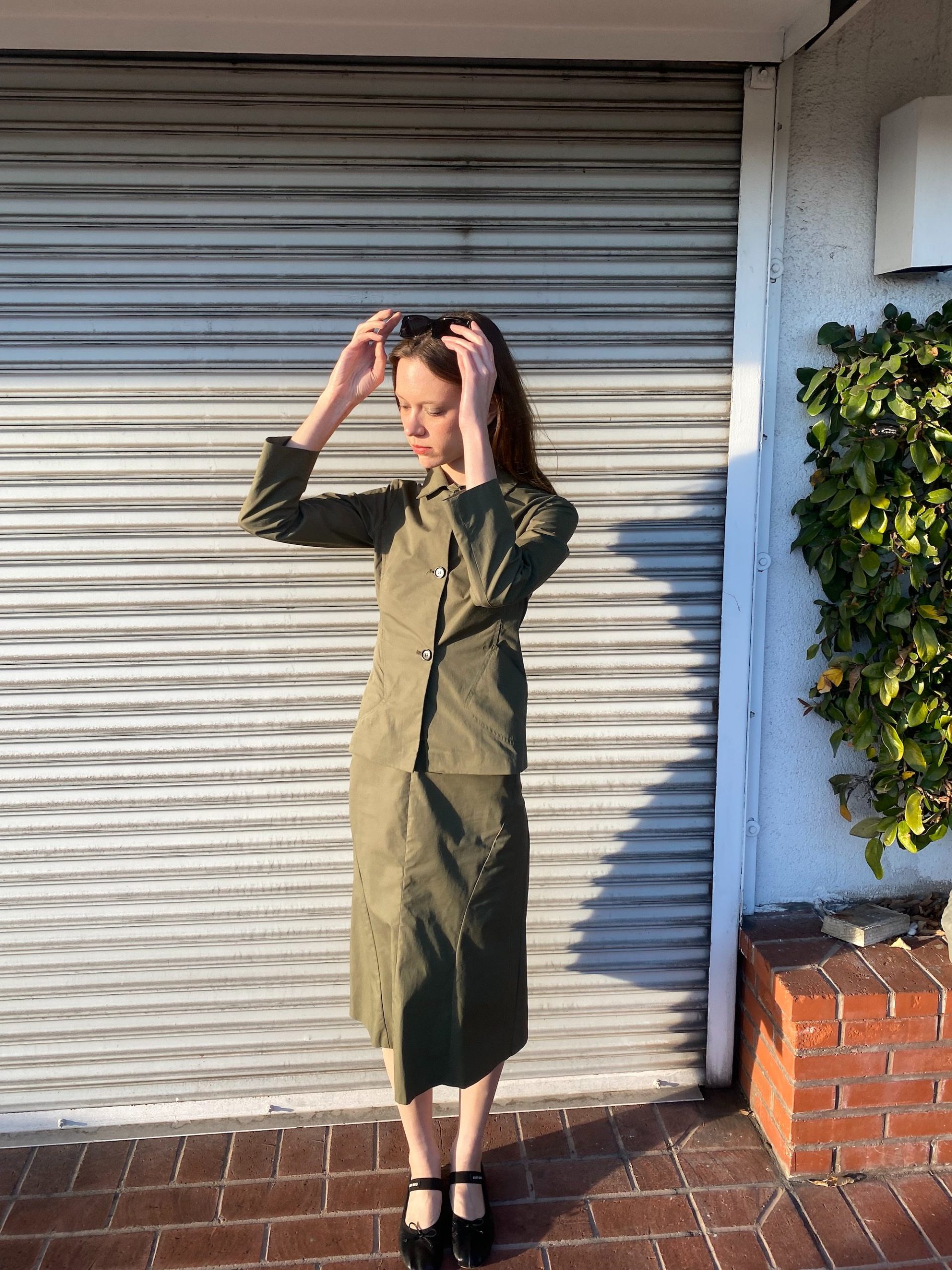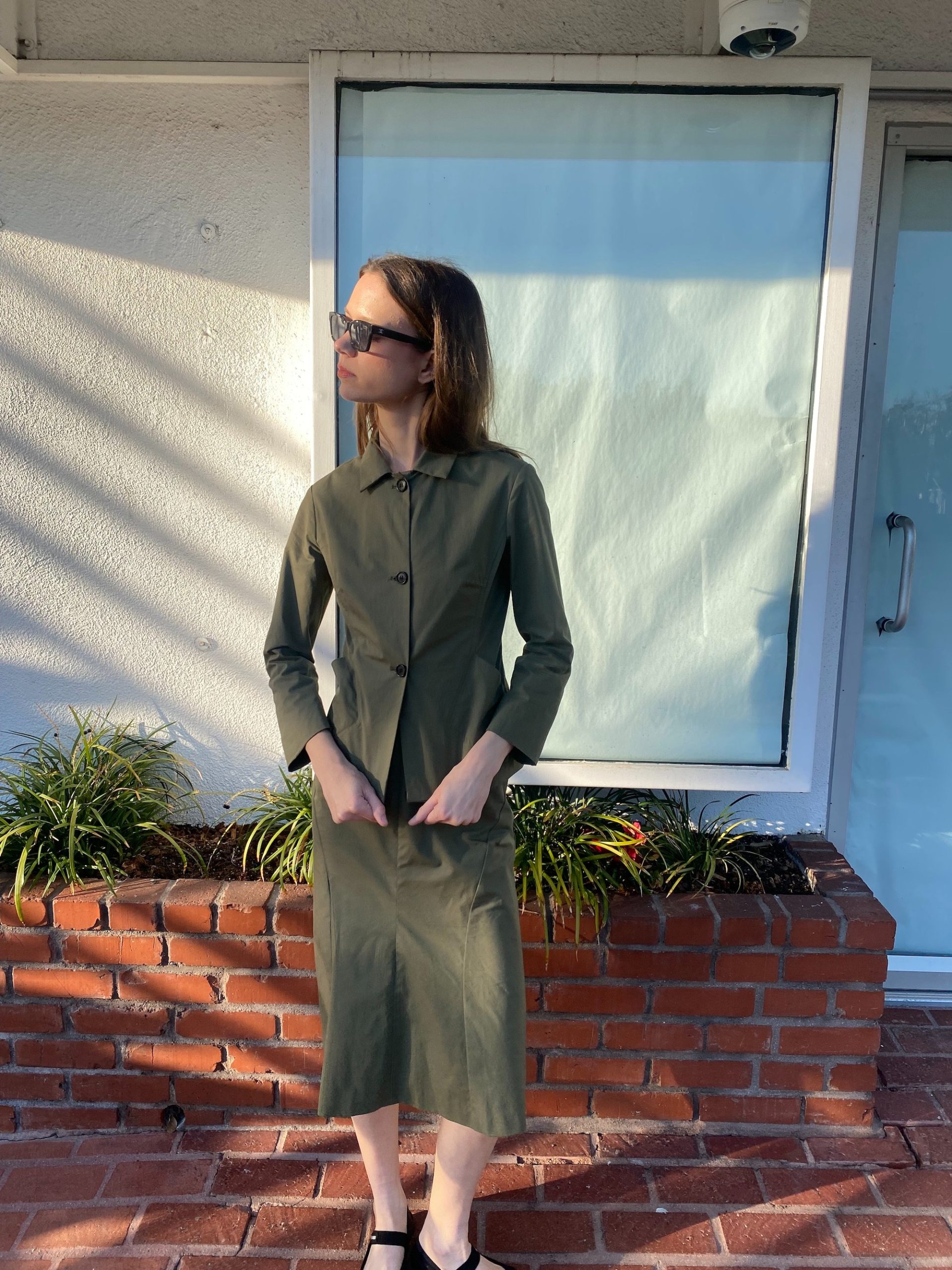 The fitted jacket and straight midi skirt create a clean, utilitarian silhouette.