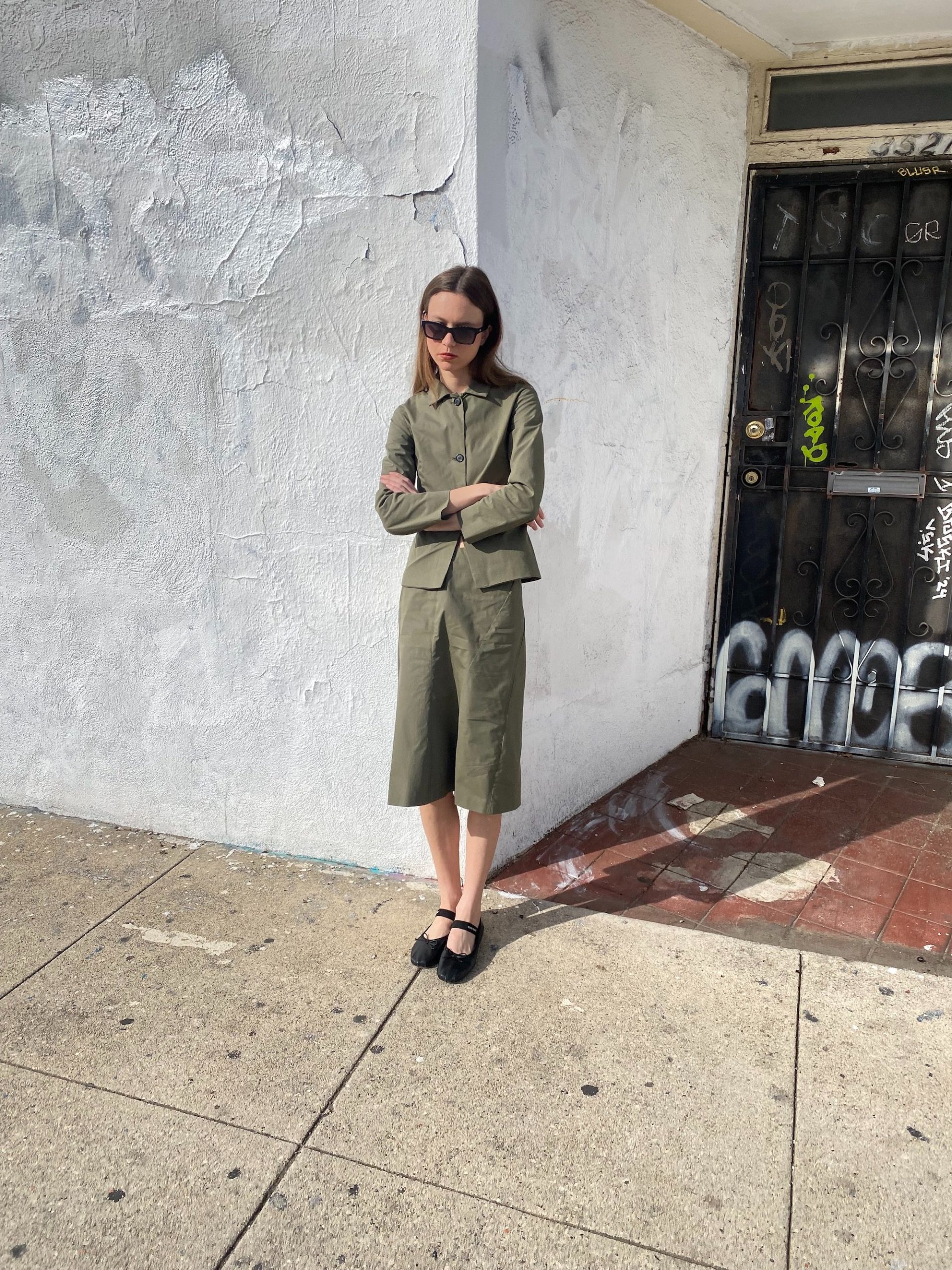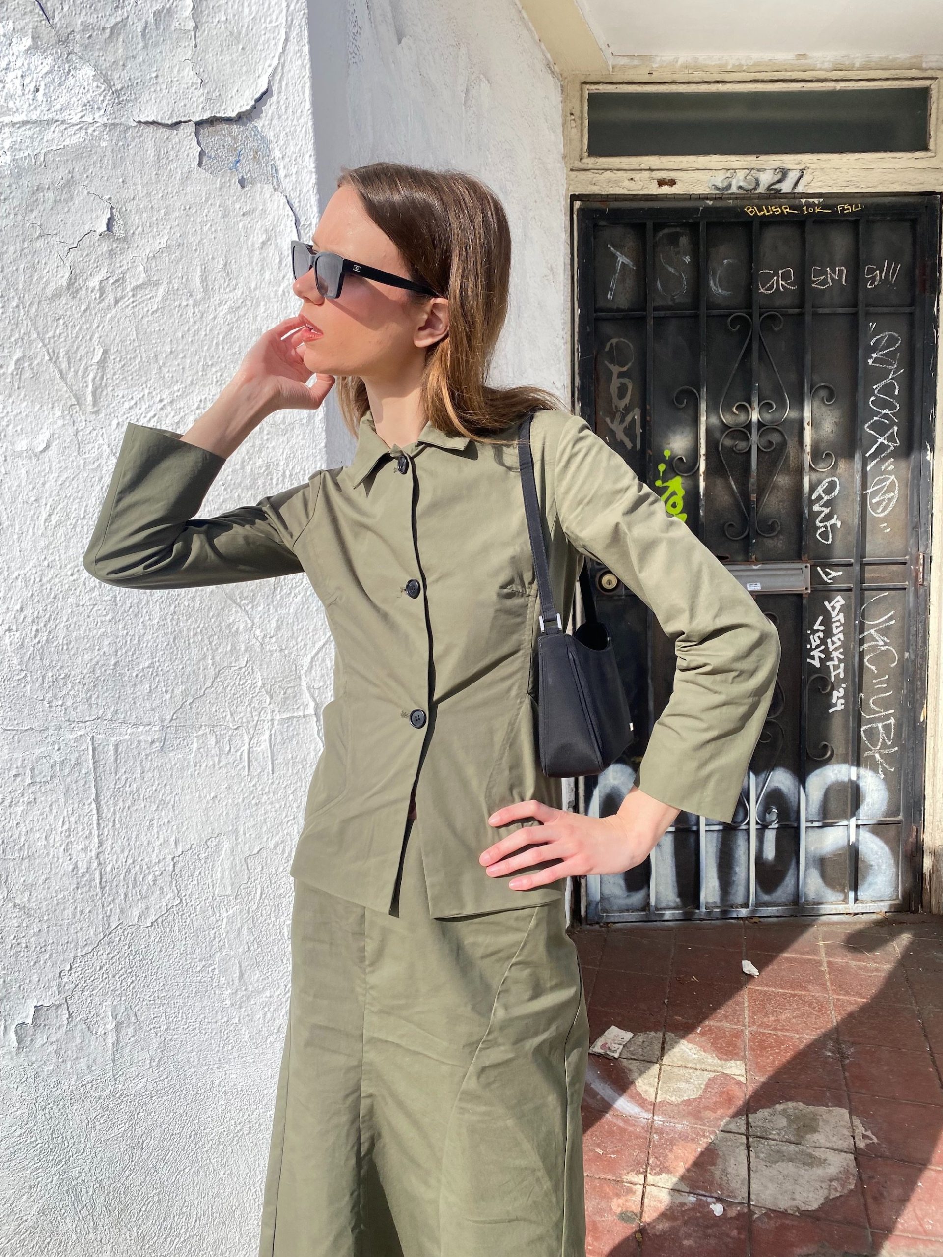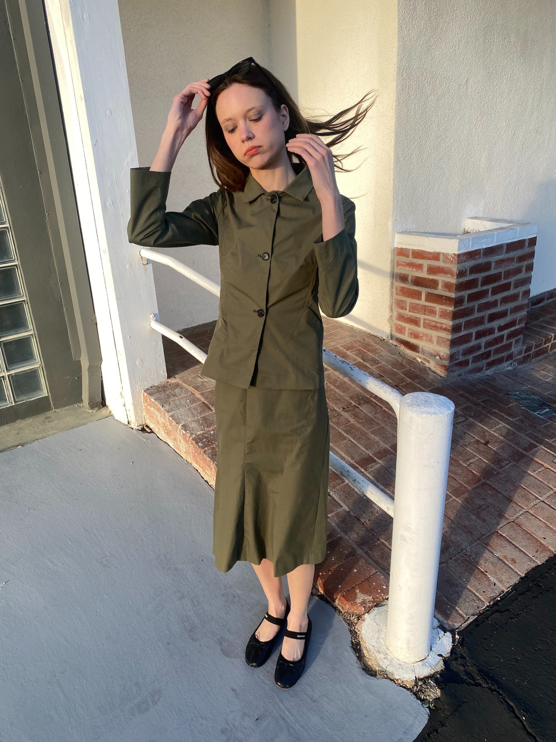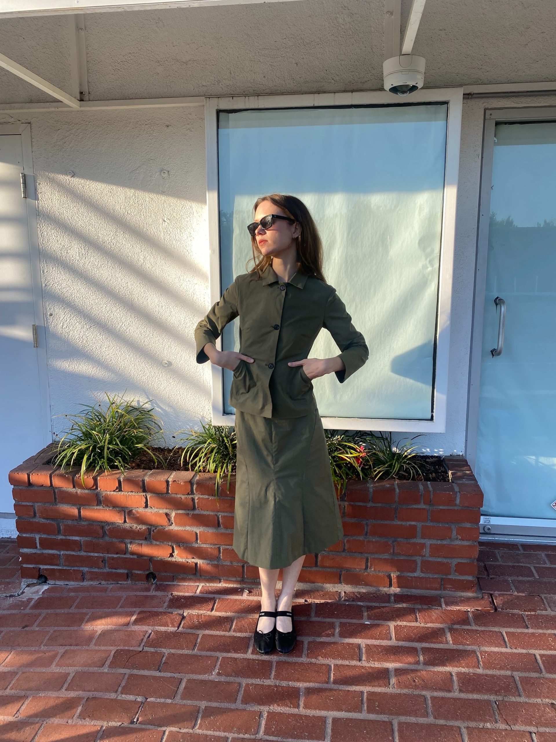 The fitted jacket and straight midi skirt create a clean, utilitarian silhouette.