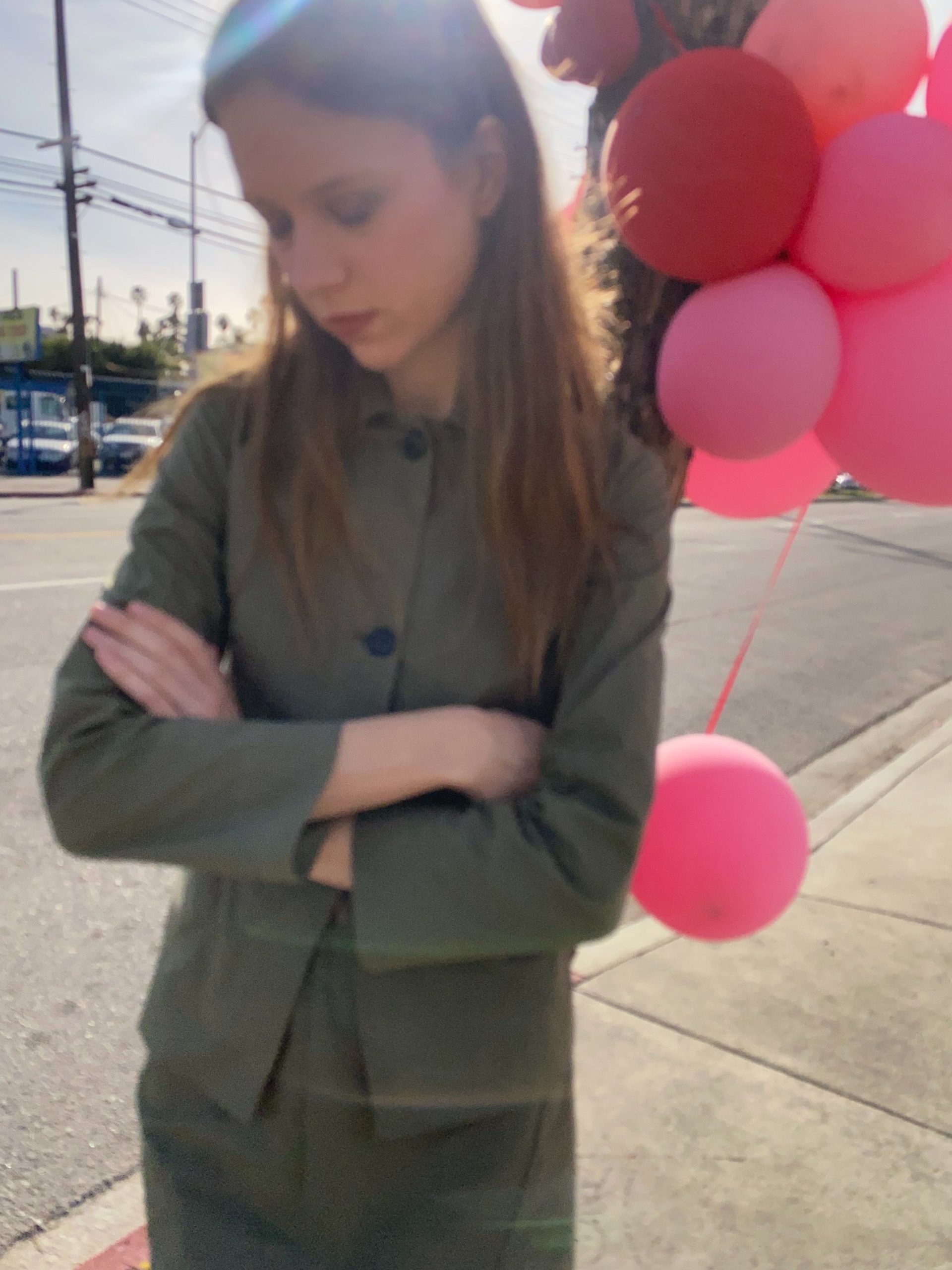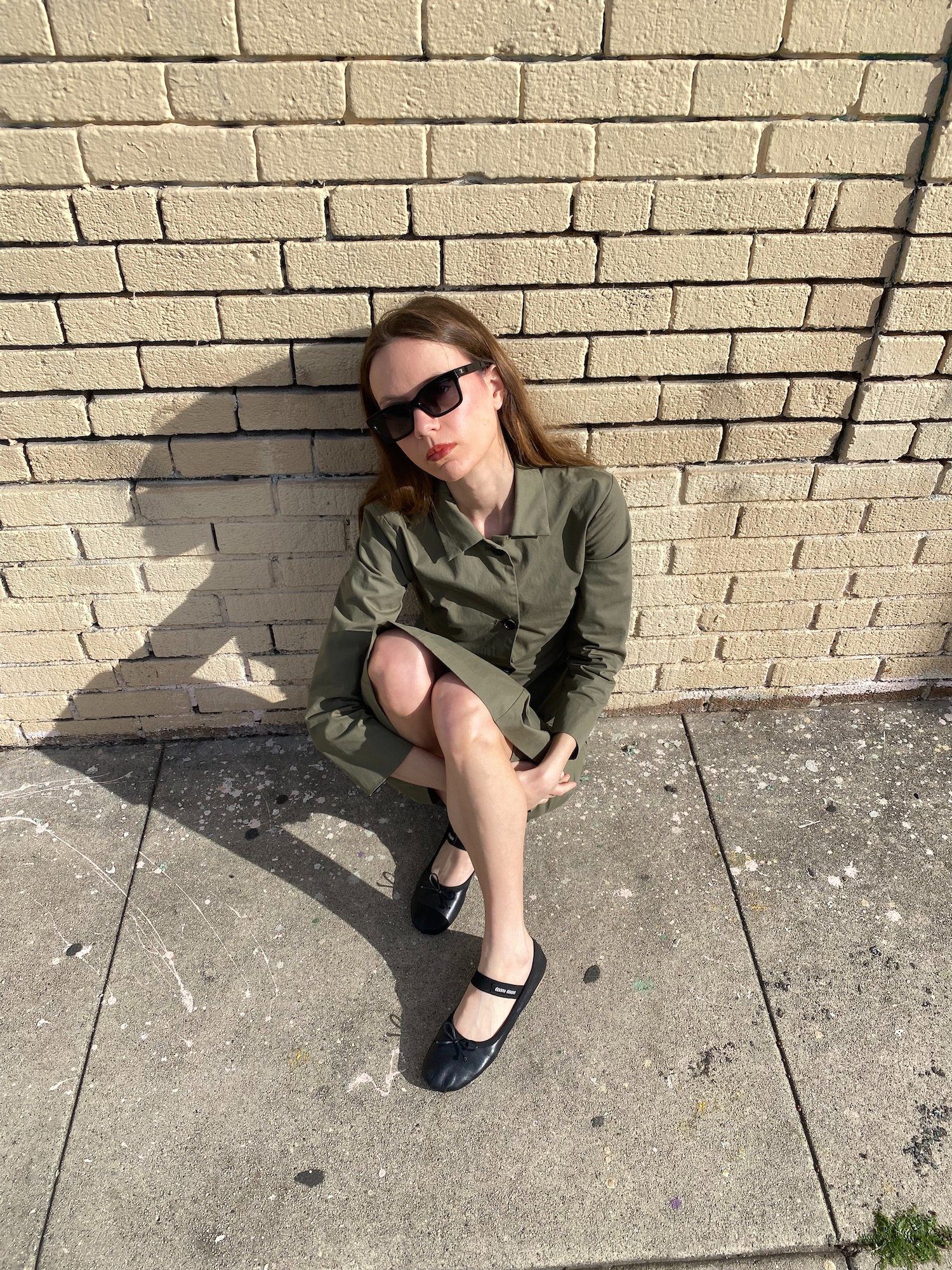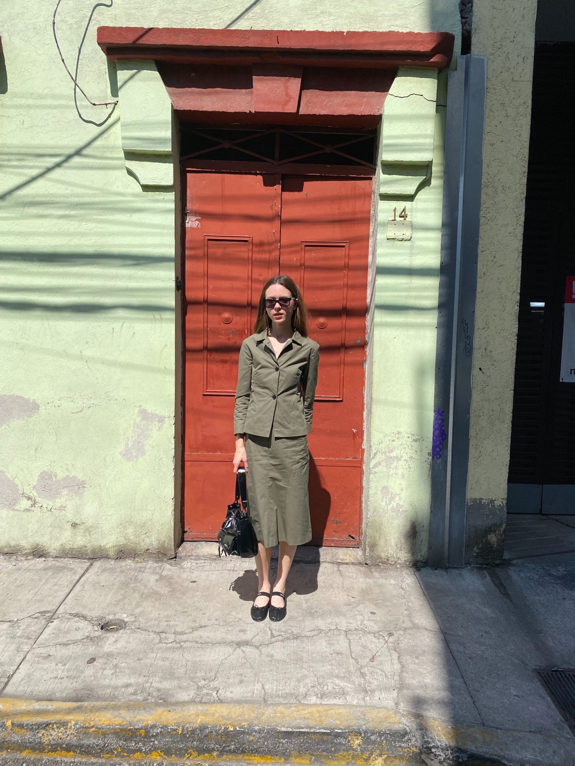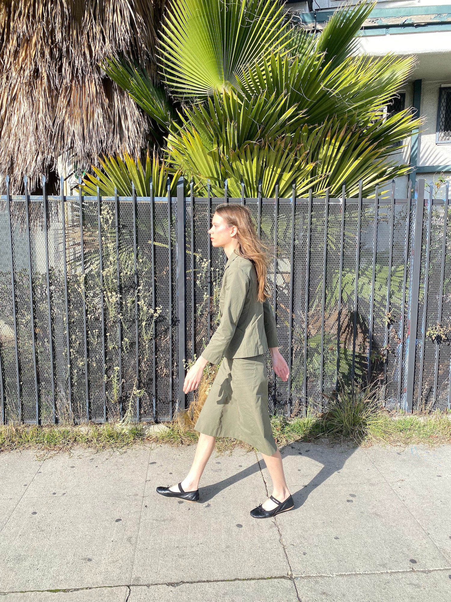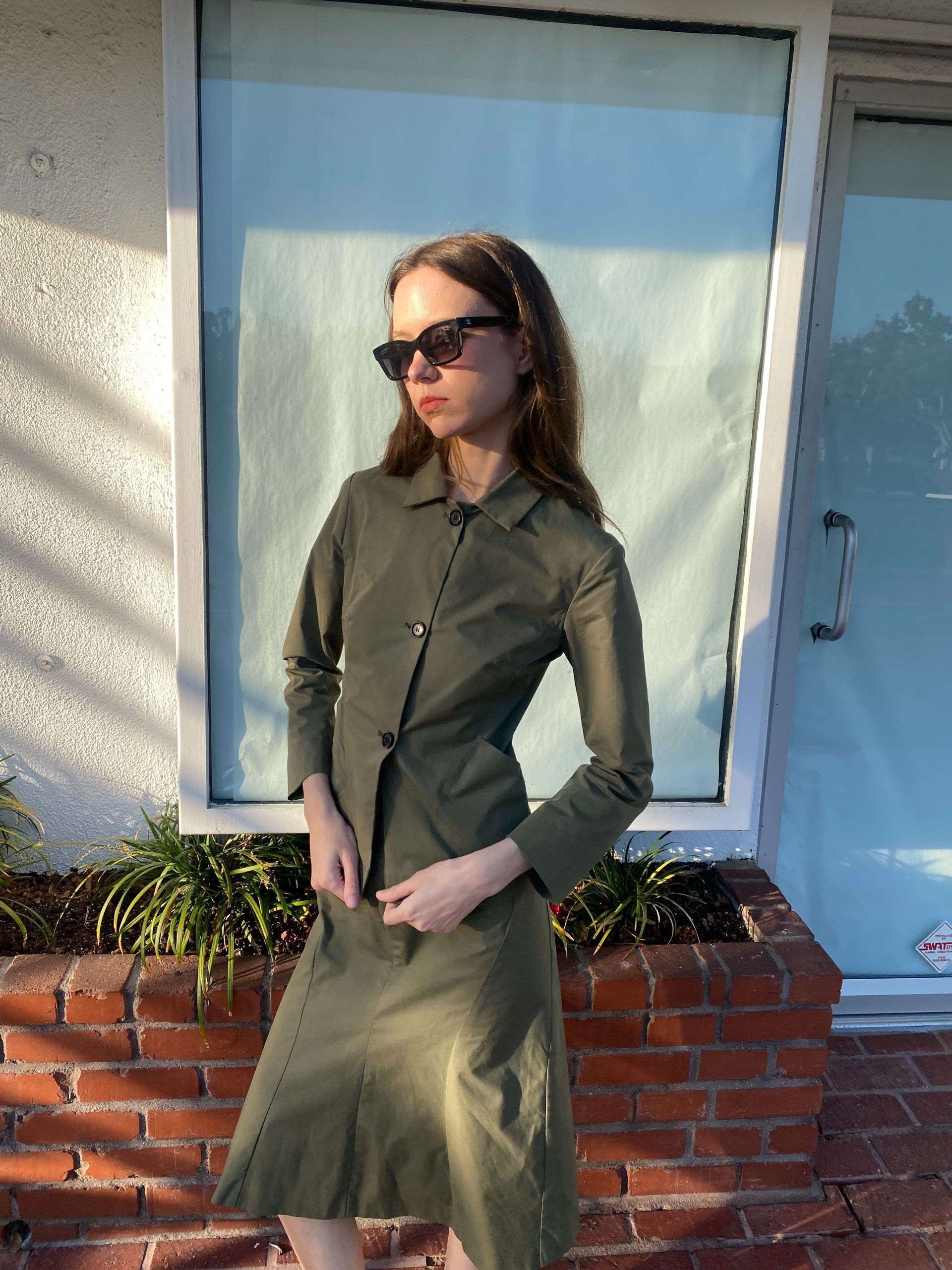 The fitted jacket and straight midi skirt create a clean, utilitarian silhouette.
