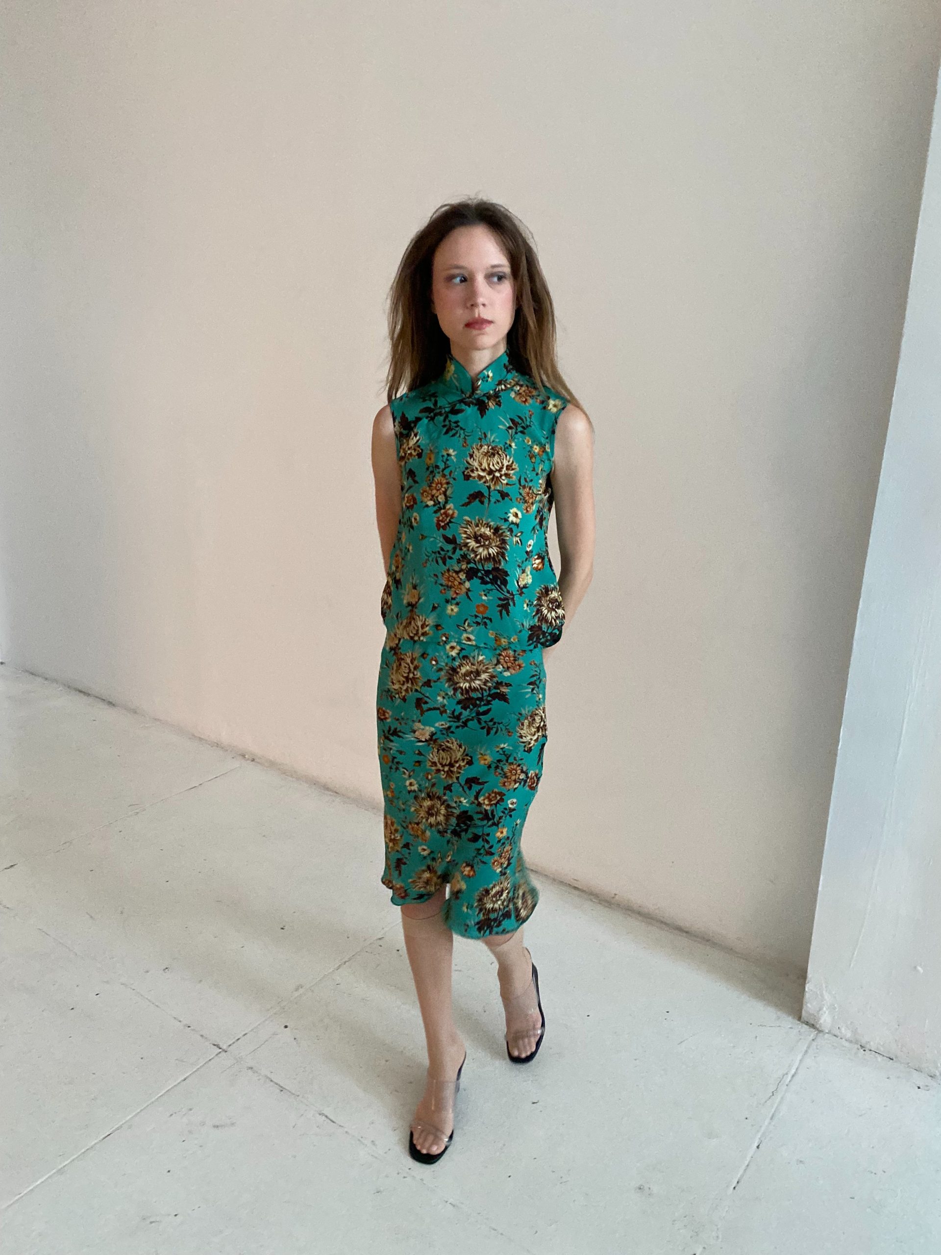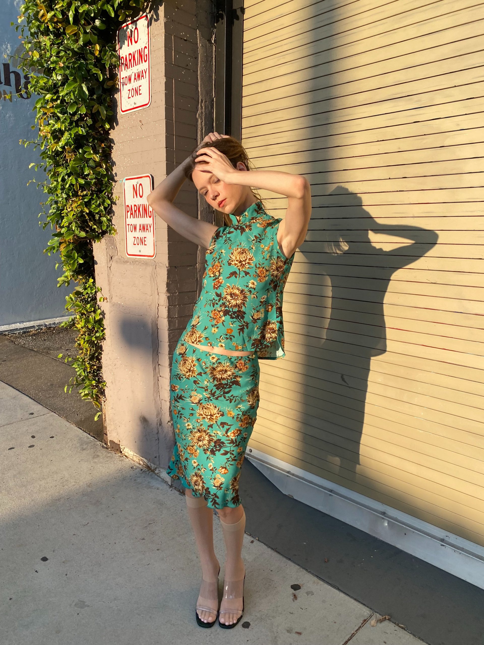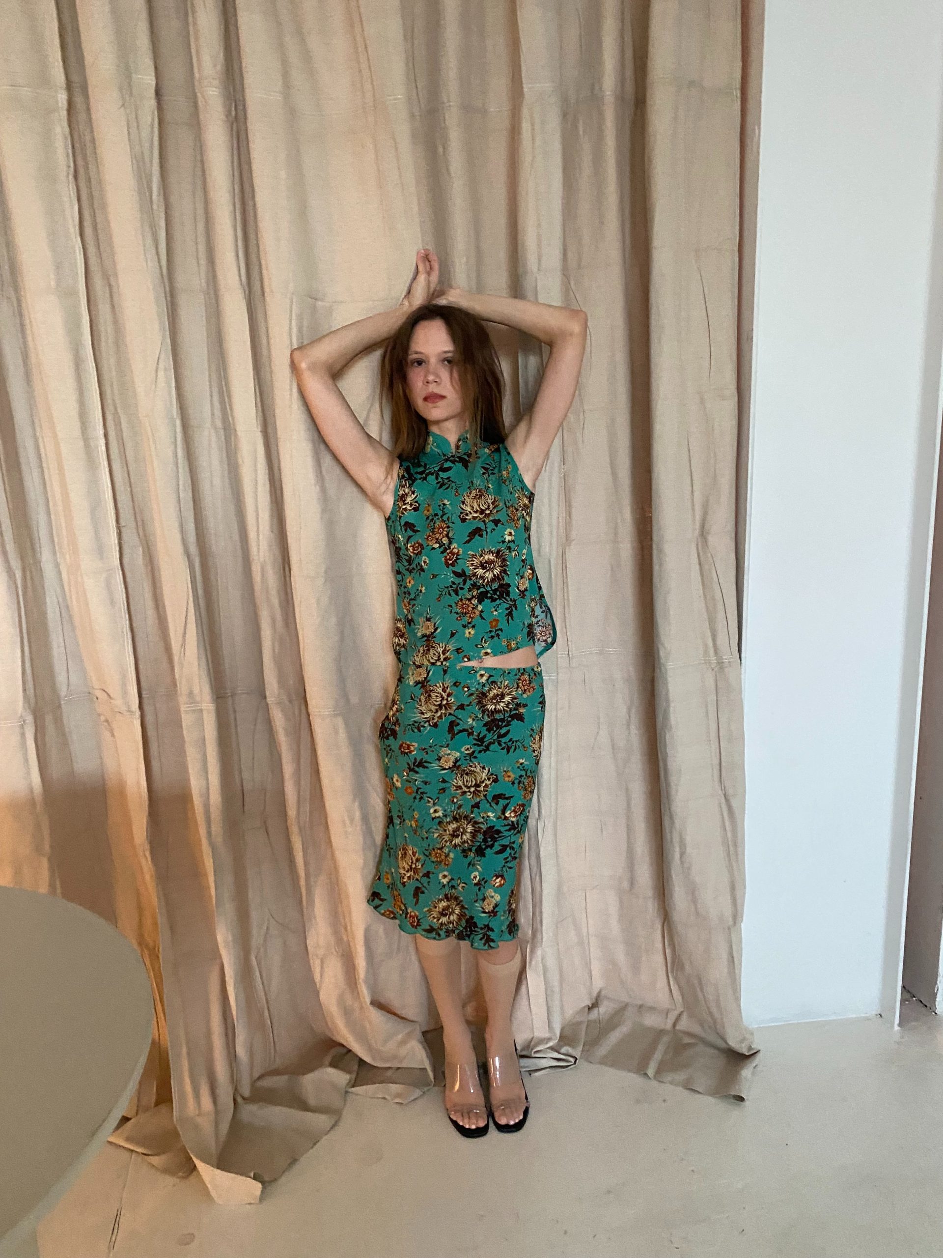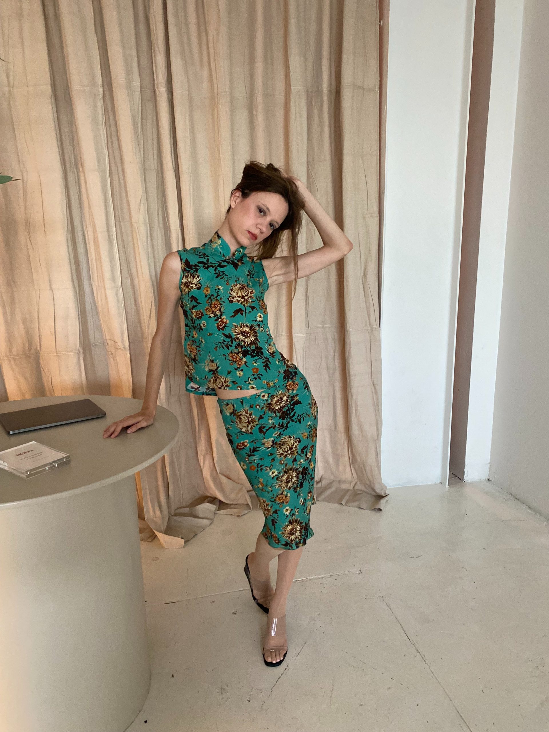 A chic skirt set includes a cheongsam-style top and bias-cut skirt in a captivating turquoise with delicate floral print. The top showcases traditional Chinese design elements like a high neckline and intricate detailing. This ensemble merges cheongsam charm with a modern touch, making it culturally rich and stylish. The floral print add vibrancy, making it an ideal choice for sophisticated events where a distinctive look is desired.