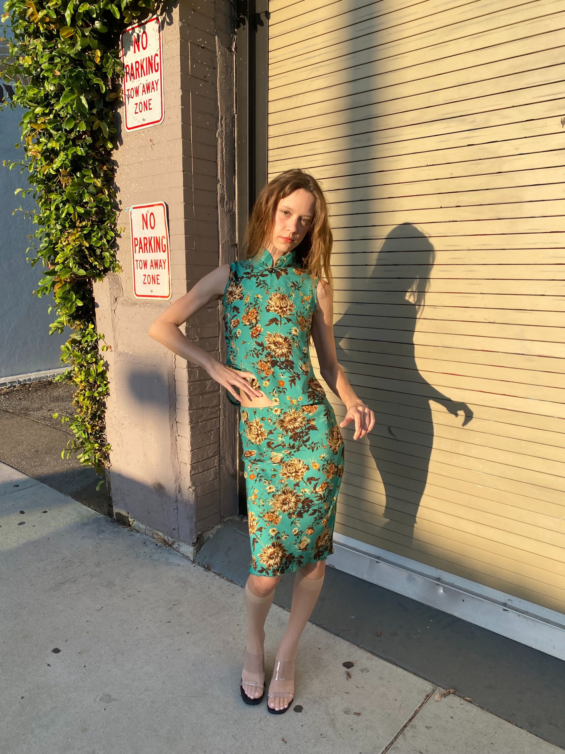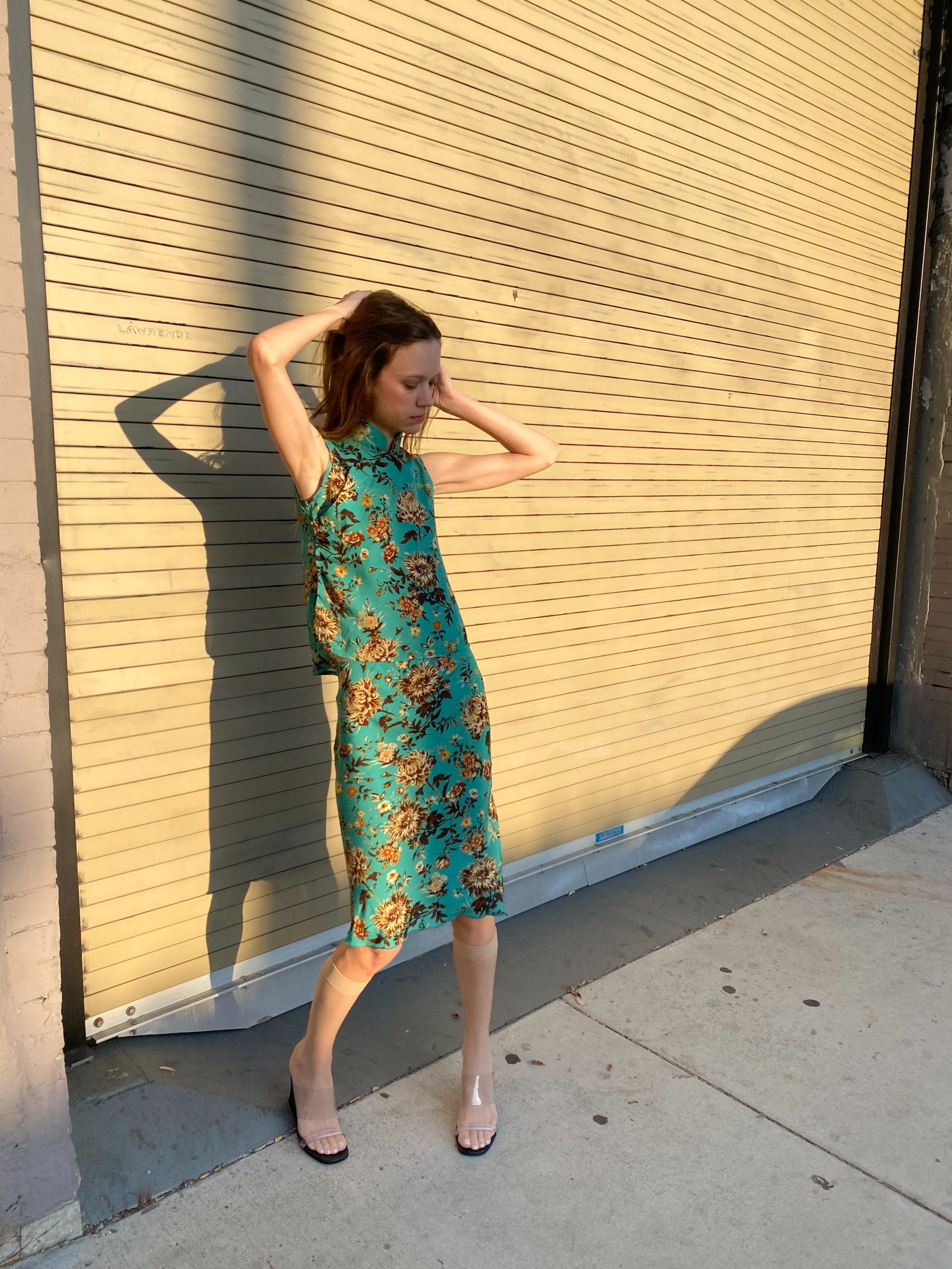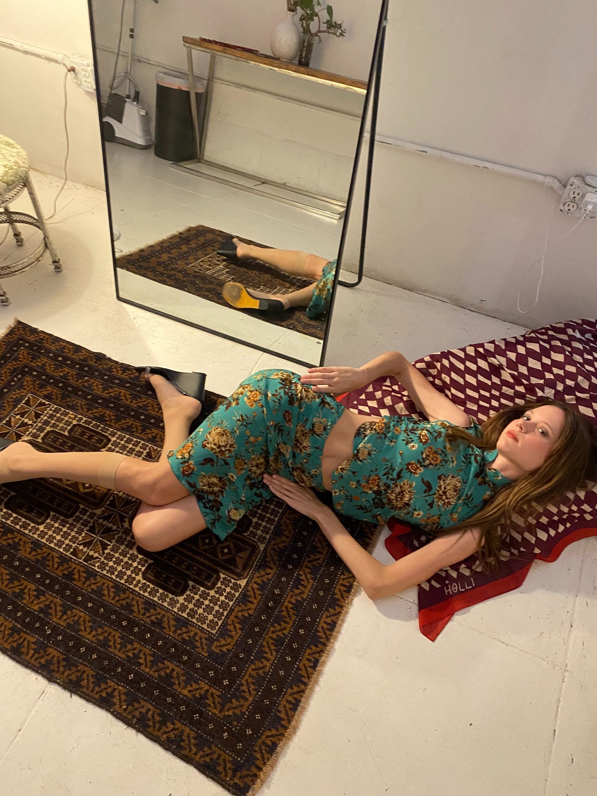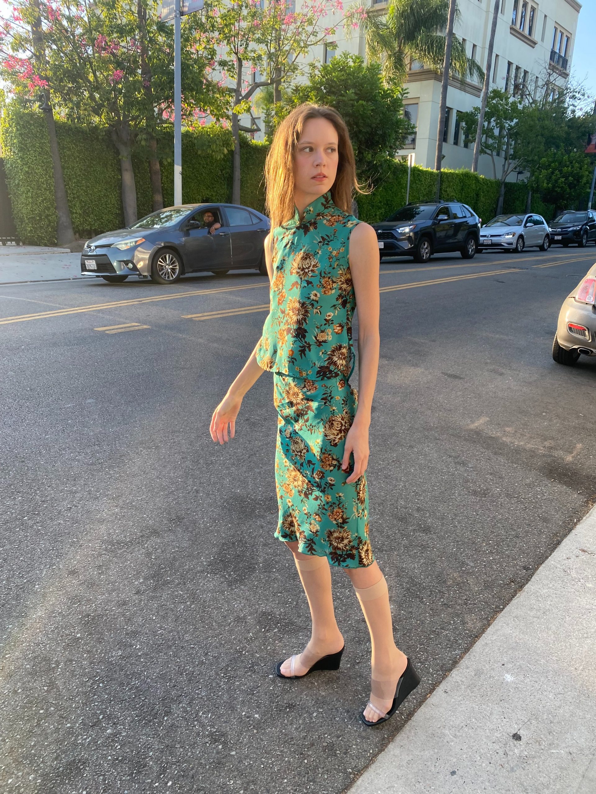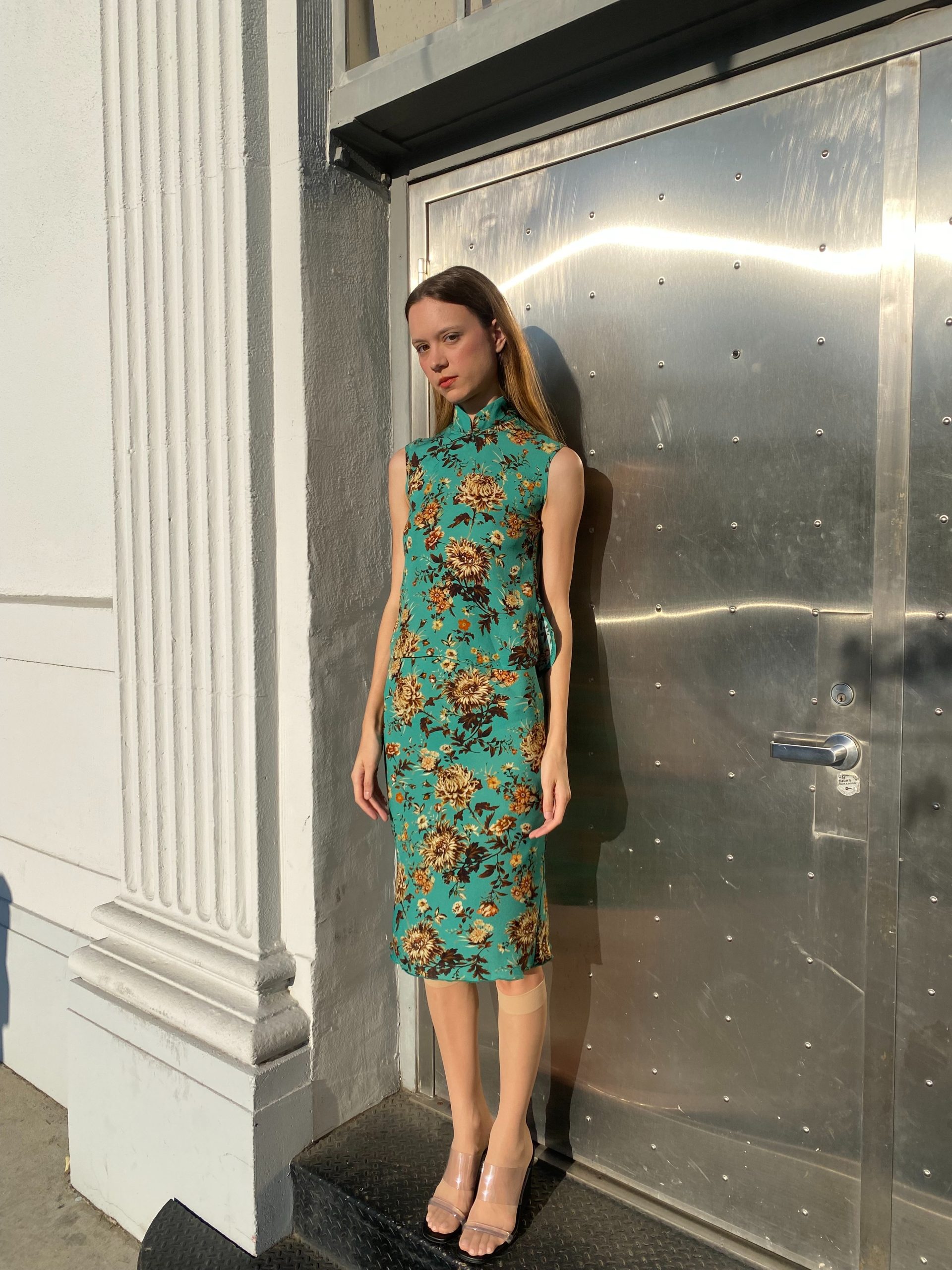 A chic skirt set includes a cheongsam-style top and bias-cut skirt in a captivating turquoise with delicate floral print. The top showcases traditional Chinese design elements like a high neckline and intricate detailing. This ensemble merges cheongsam charm with a modern touch, making it culturally rich and stylish. The floral print add vibrancy, making it an ideal choice for sophisticated events where a distinctive look is desired.