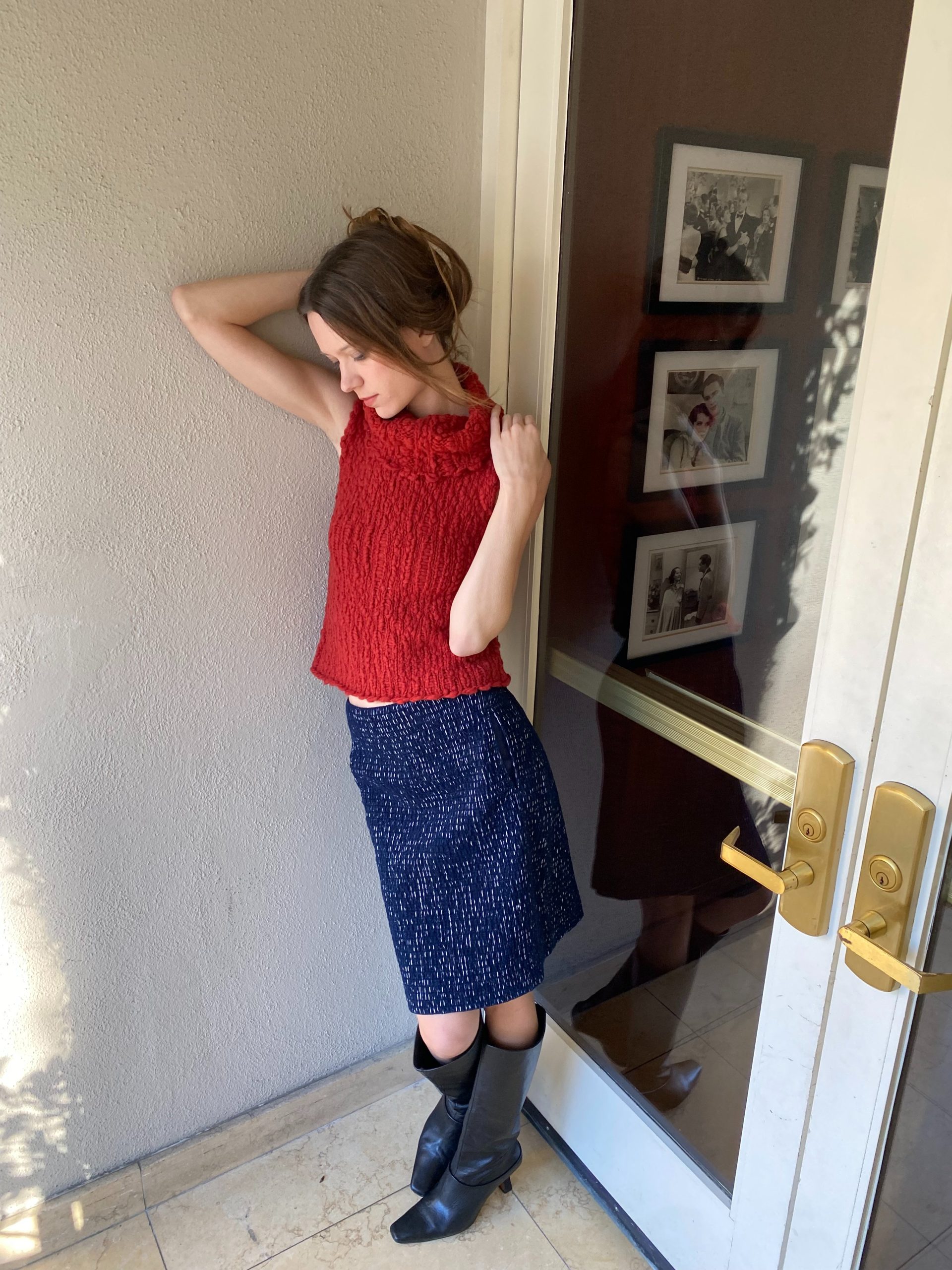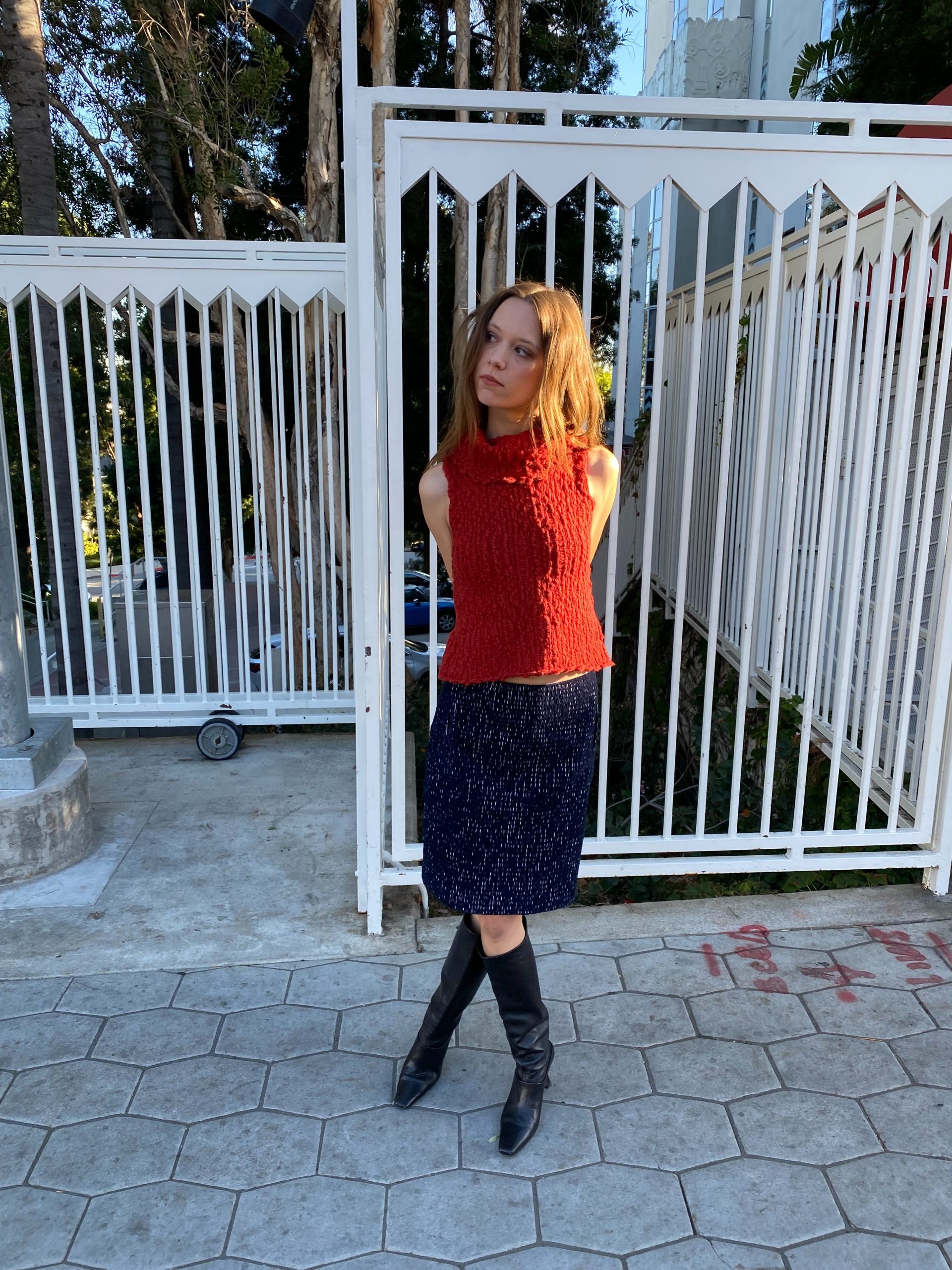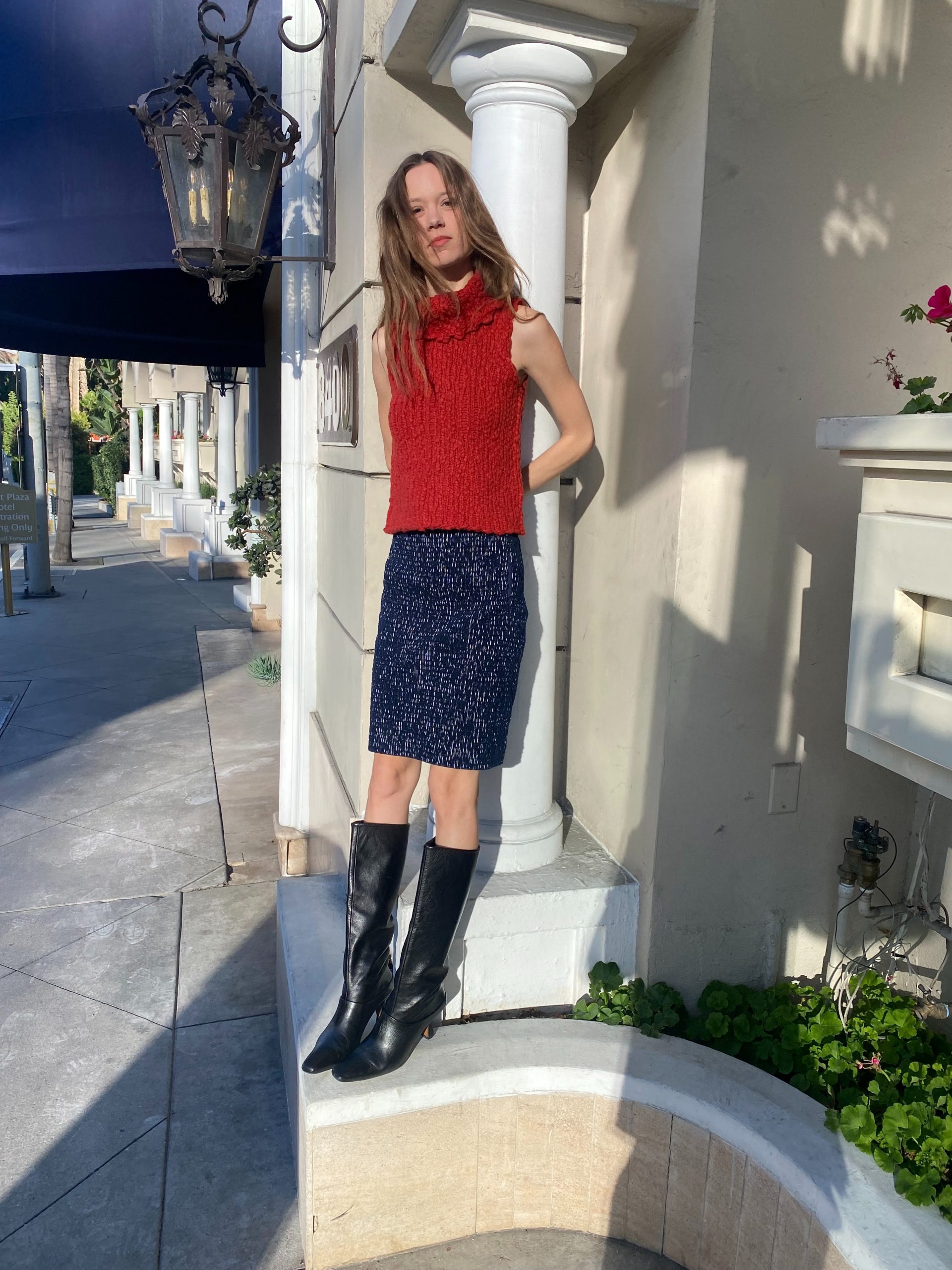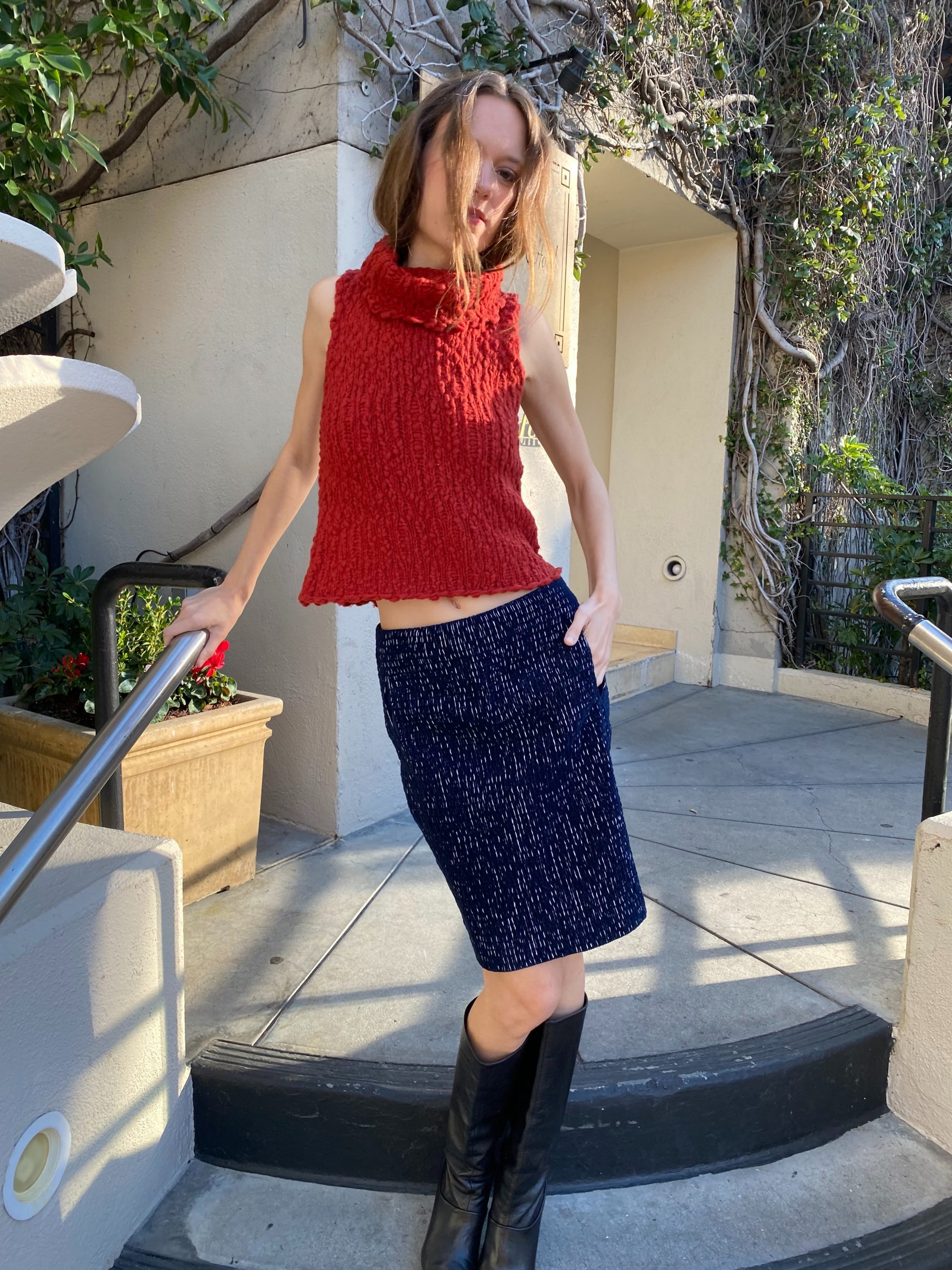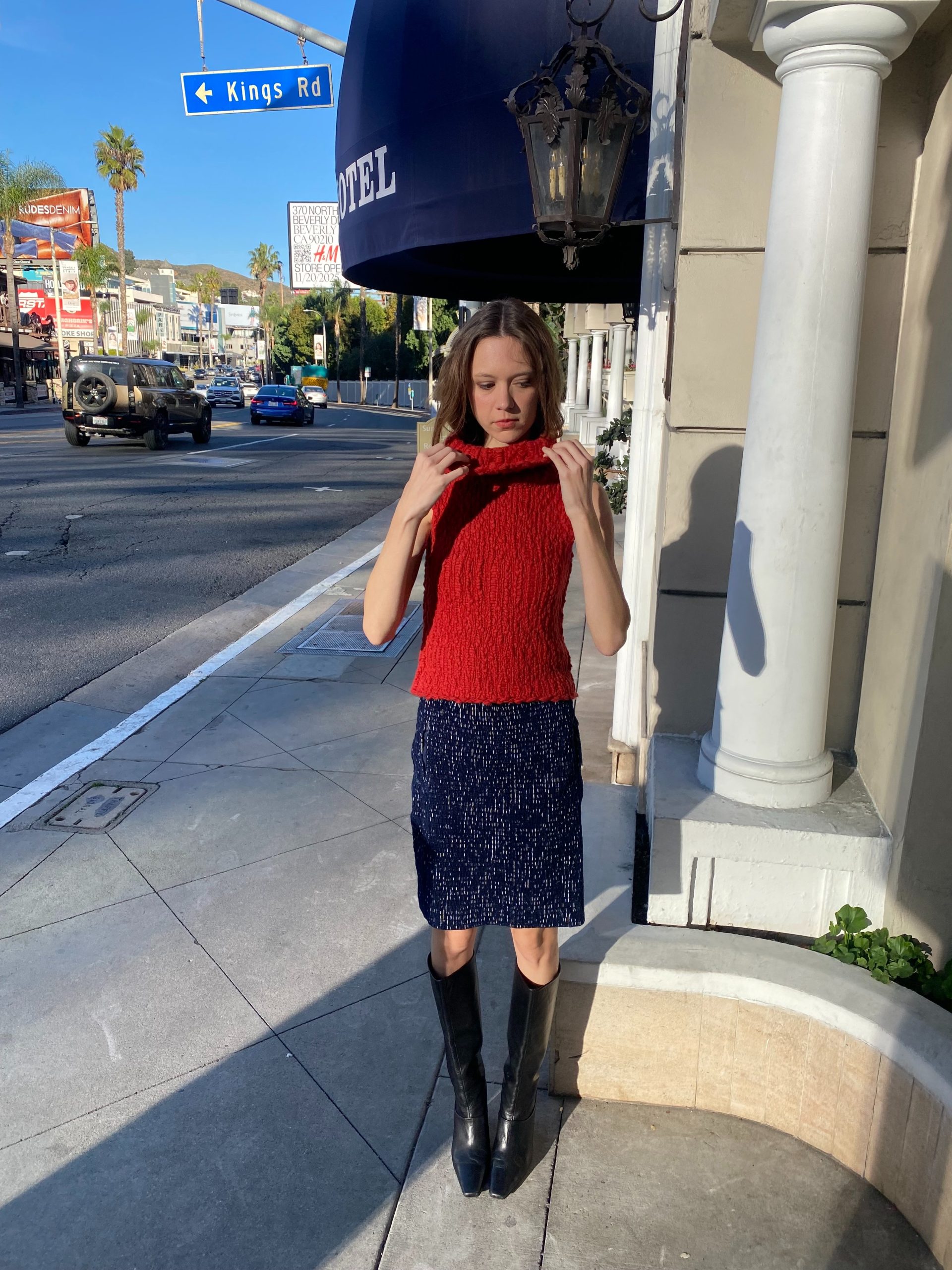 The look features a sleeveless, chunky-knit red turtleneck top, paired with a knee-length navy tweed skirt flecked with white. The contrast between the cozy red knit and structured skirt creates a balanced, modern silhouette. Black leather knee boots ground the outfit with a sleek edge, while the overall mood feels effortlessly chic — a mix of warmth, texture, and understated sophistication.