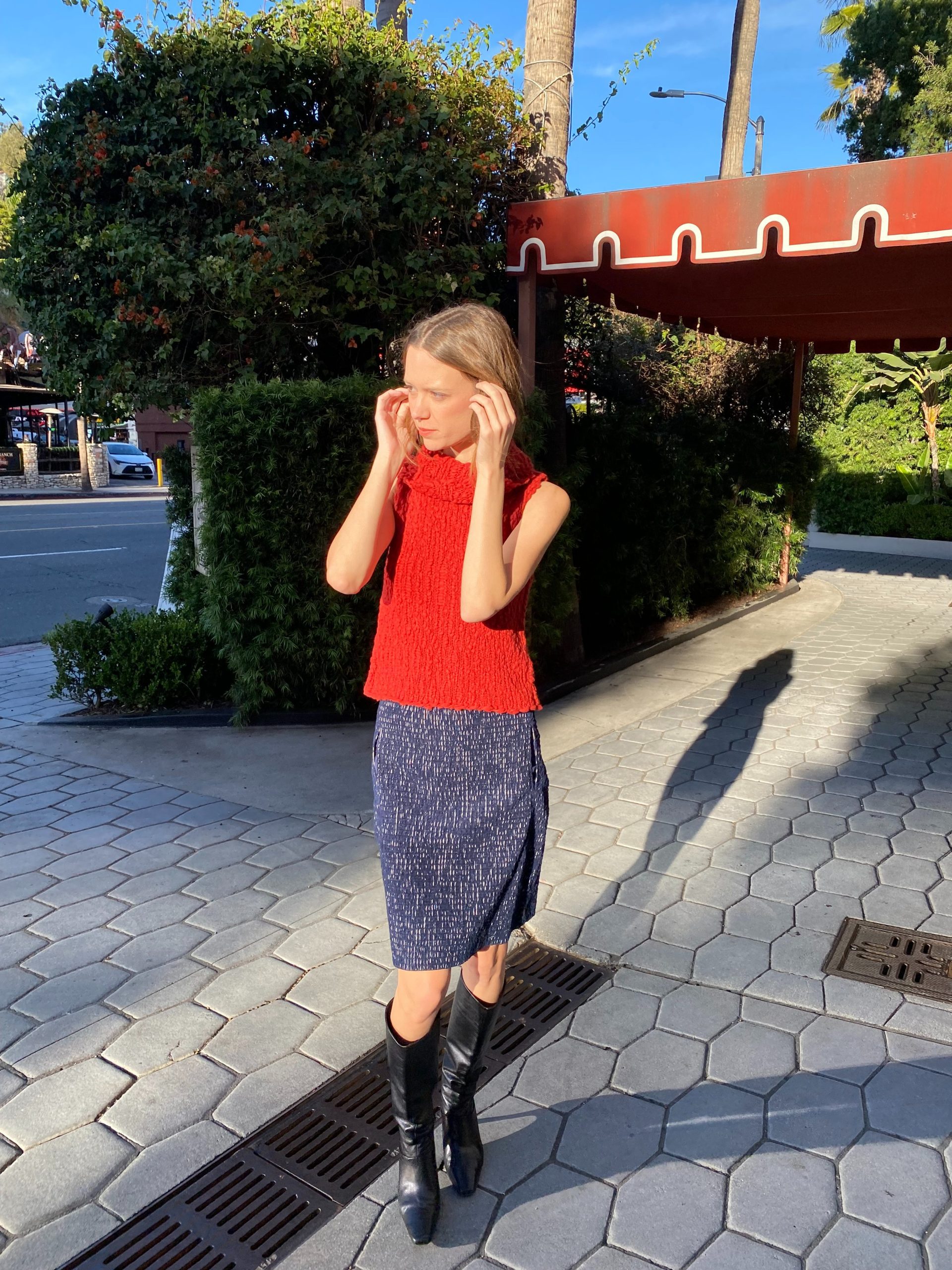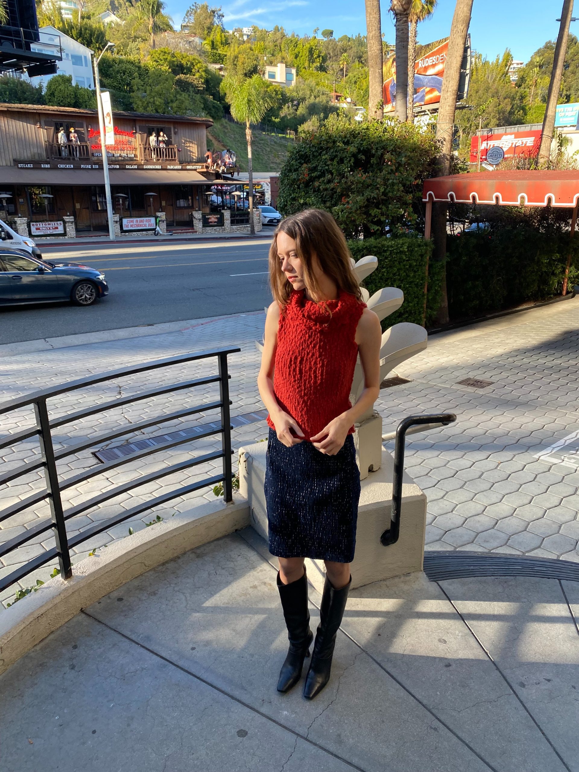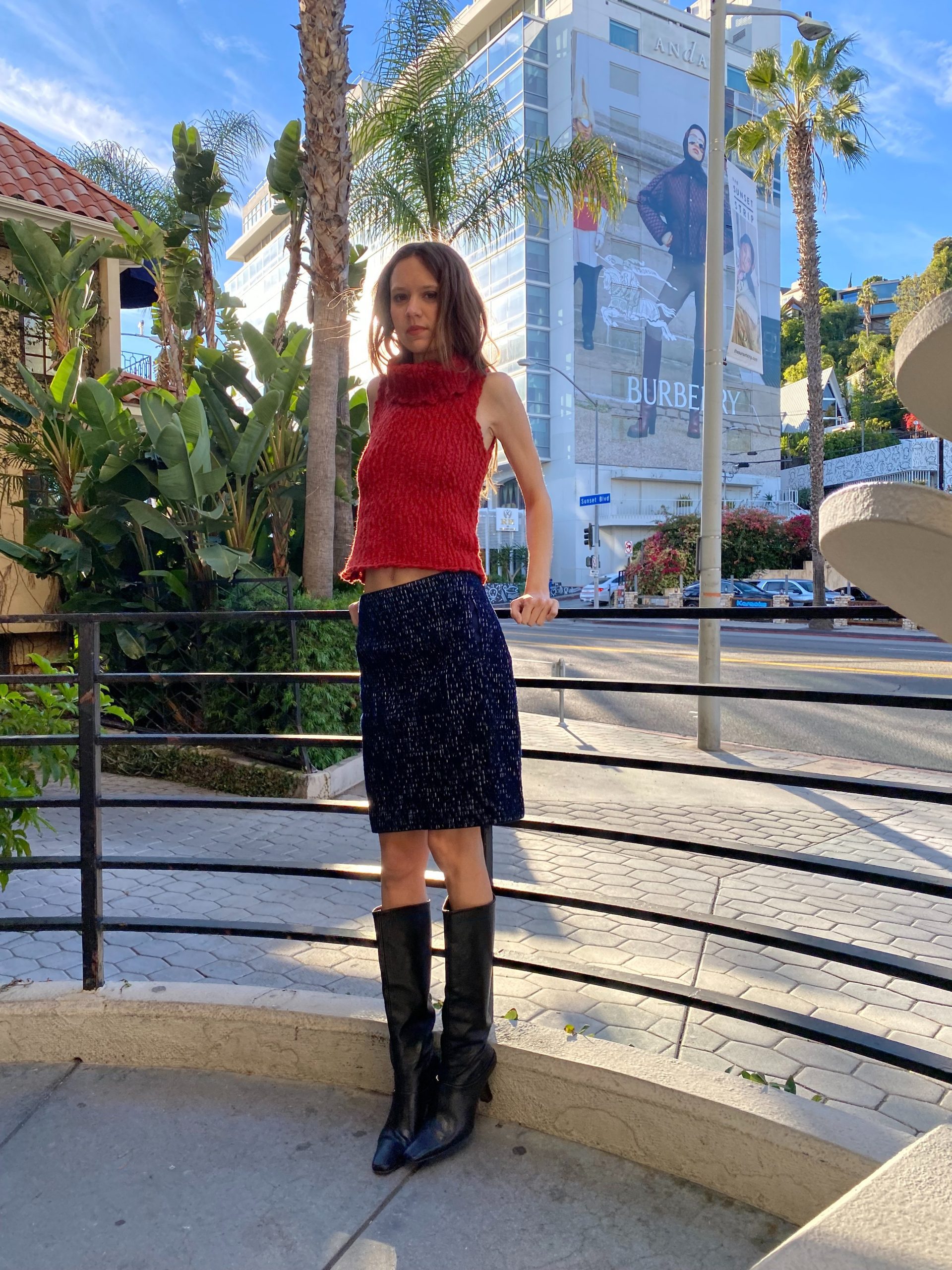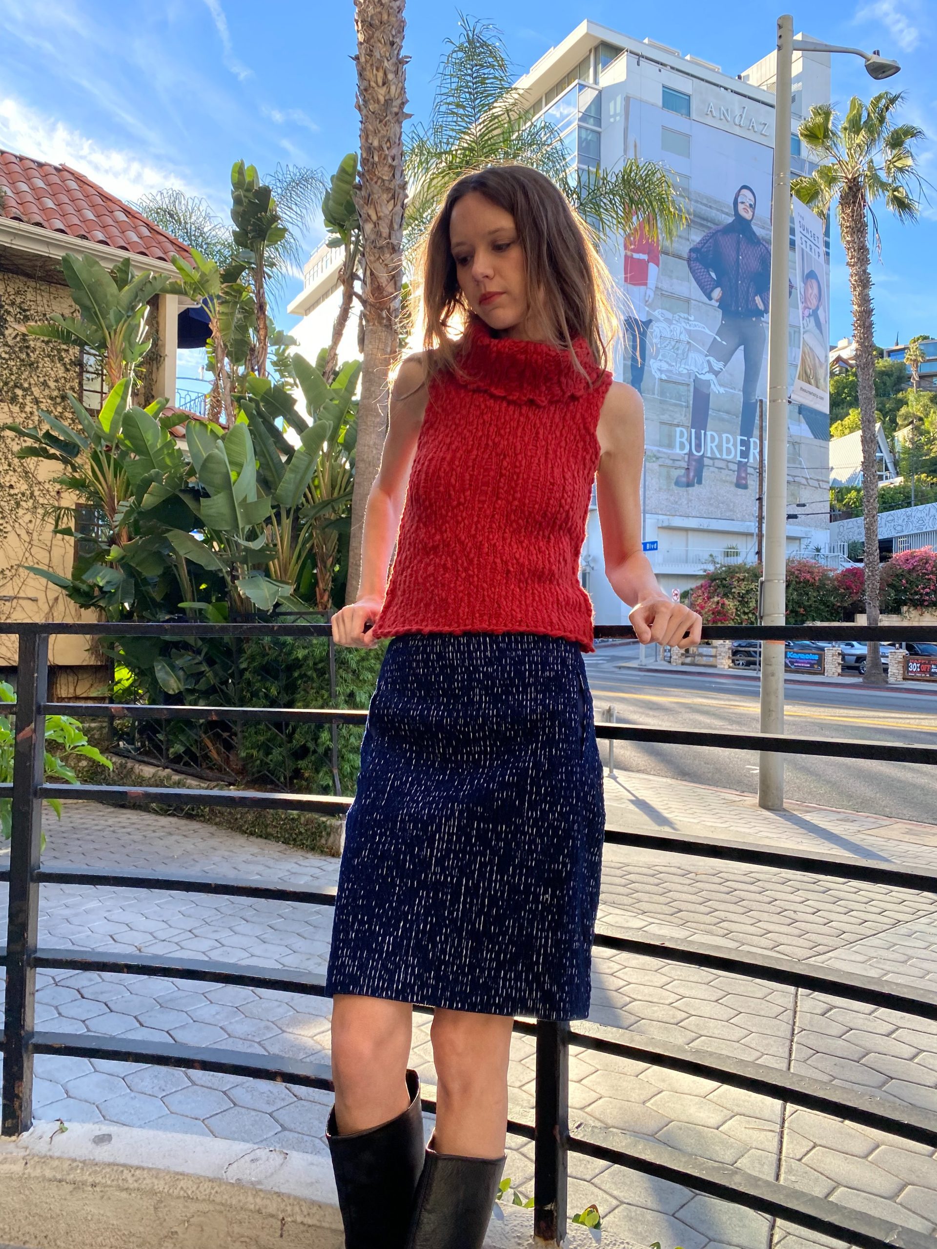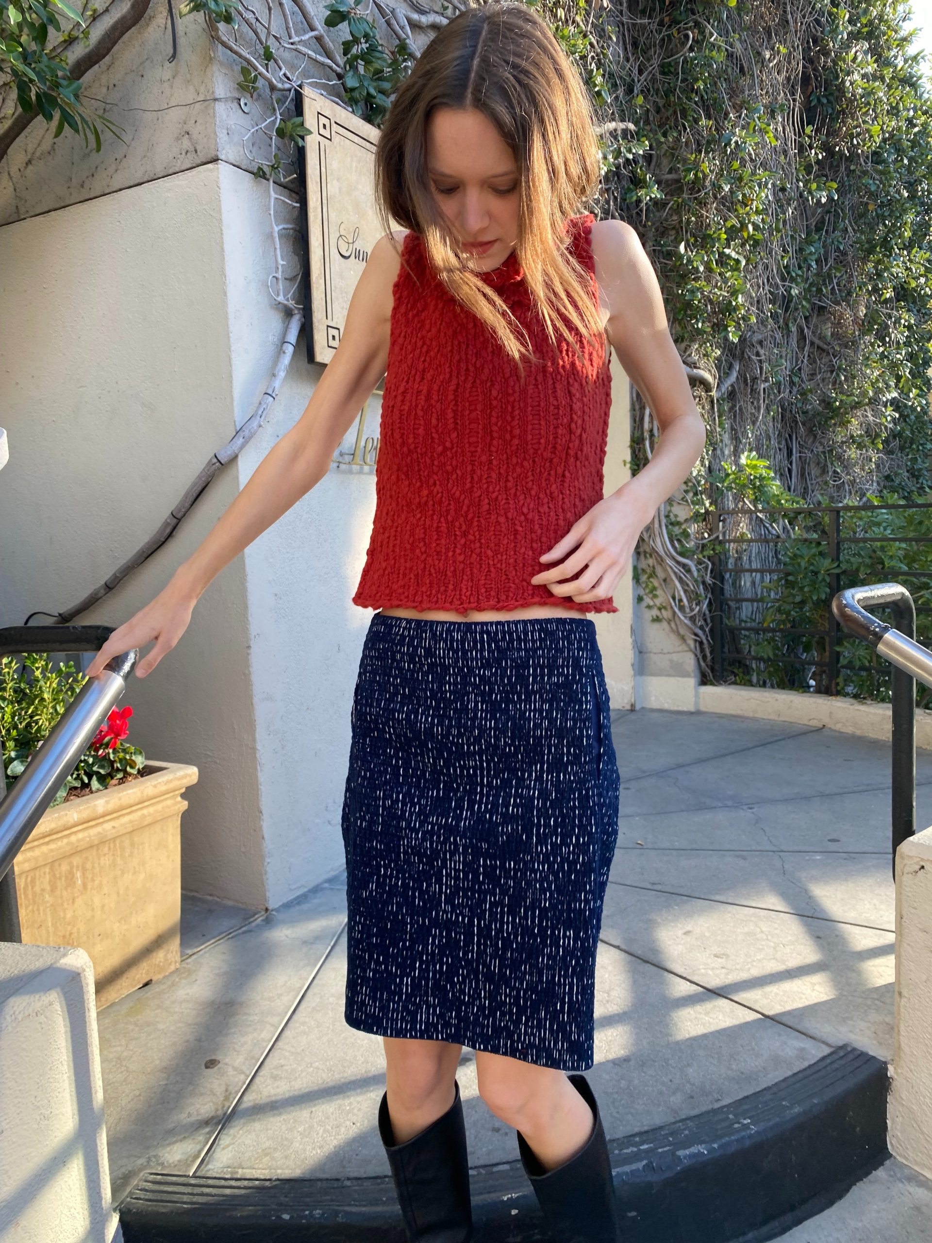 The look features a sleeveless, chunky-knit red turtleneck top, paired with a knee-length navy tweed skirt flecked with white. The contrast between the cozy red knit and structured skirt creates a balanced, modern silhouette. Black leather knee boots ground the outfit with a sleek edge, while the overall mood feels effortlessly chic — a mix of warmth, texture, and understated sophistication.