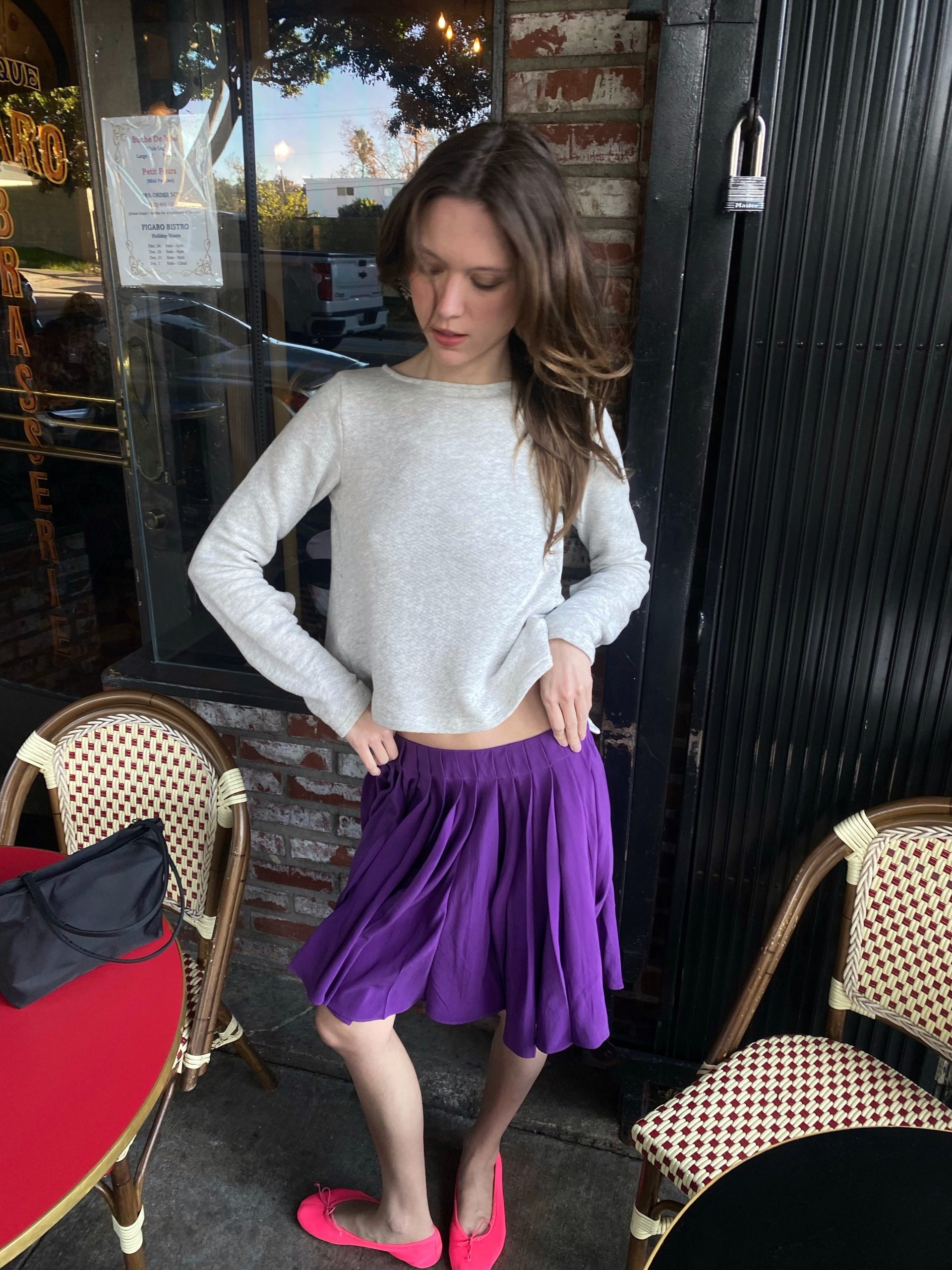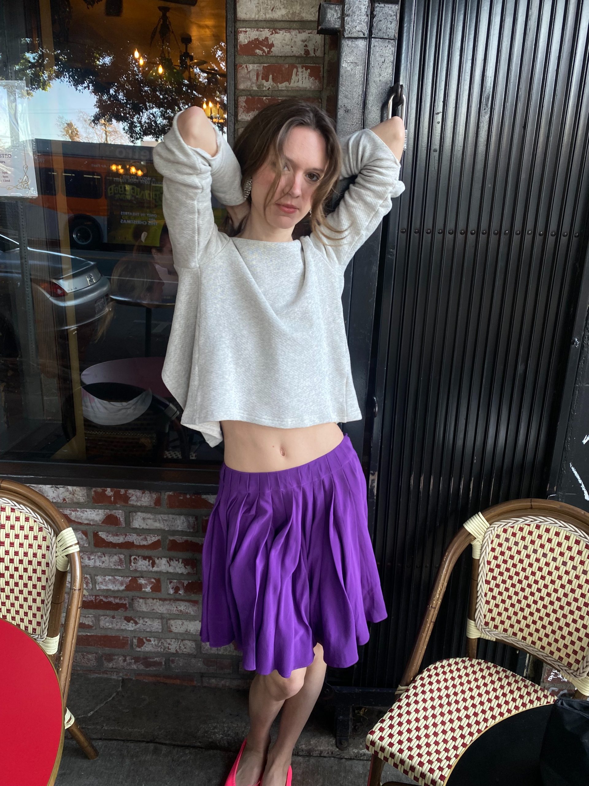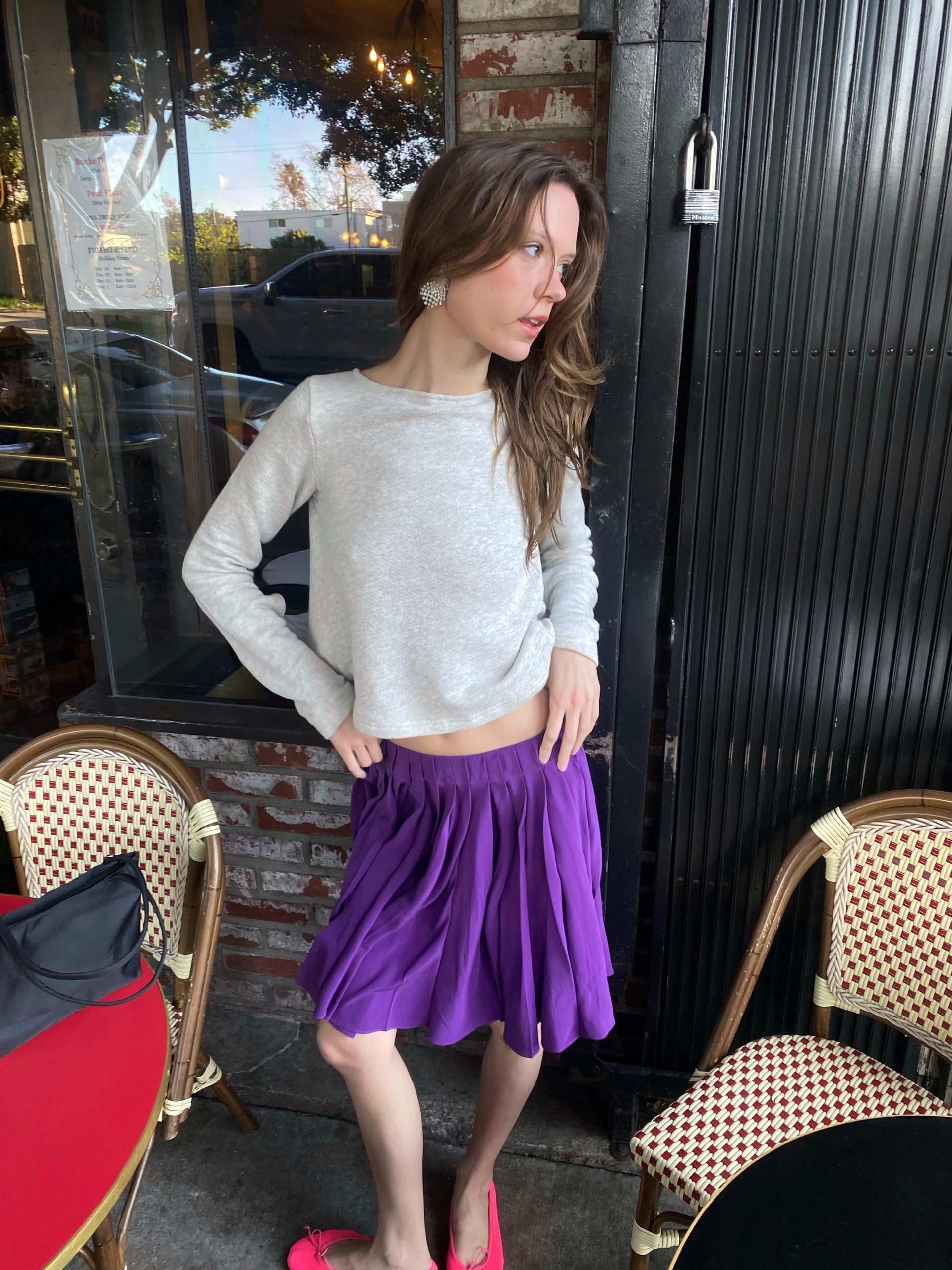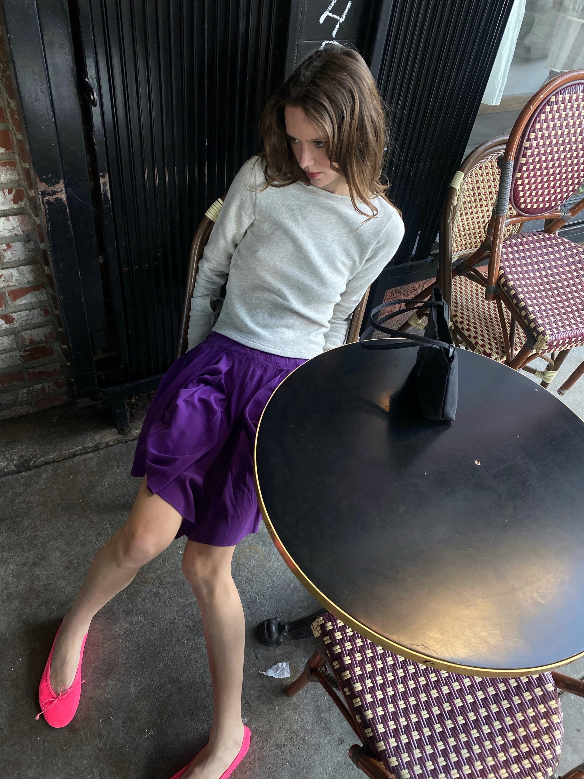 A soft grey sweatshirt with an unexpected twist — an open back tied with an elegant bow, blending casual comfort with a hint of allure. It’s paired with a deep purple pleated silk skirt that moves gracefully with every step. The look feels fresh, youthful, and effortlessly romantic — like a modern take on French-girl charm.
