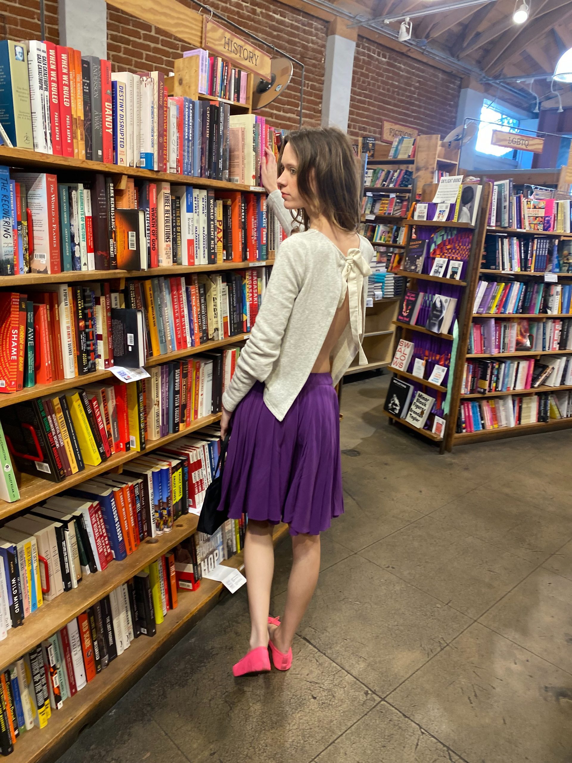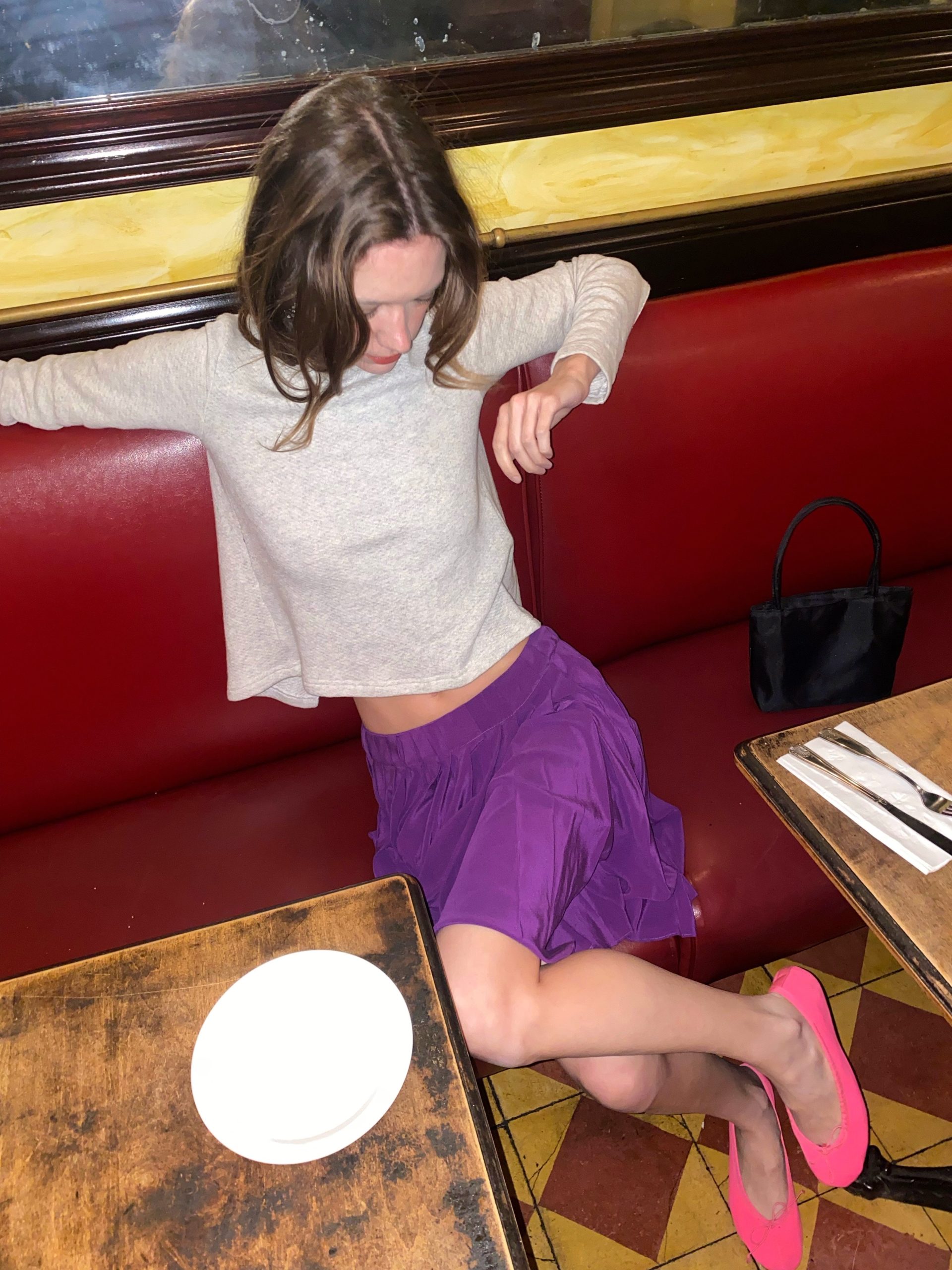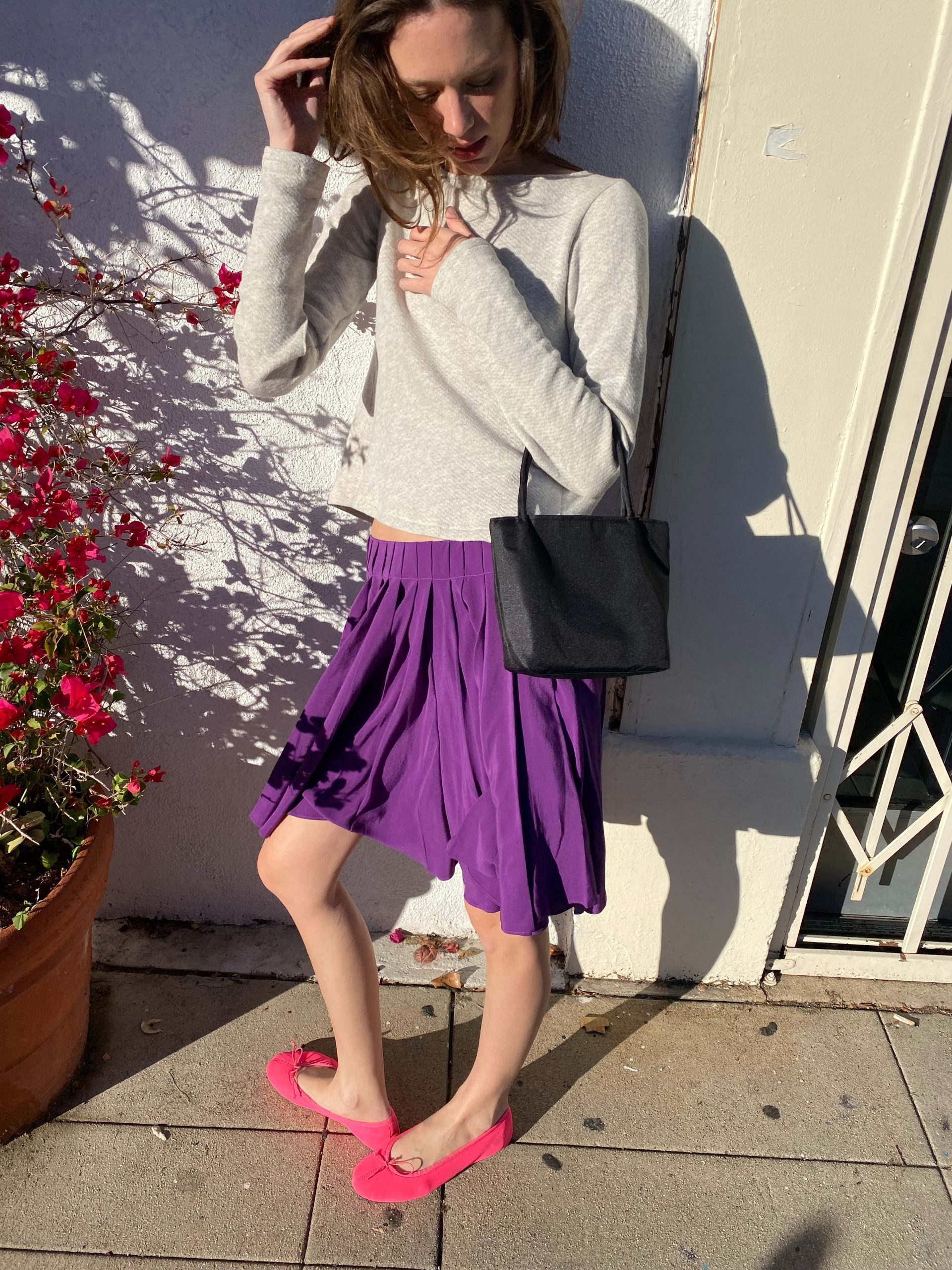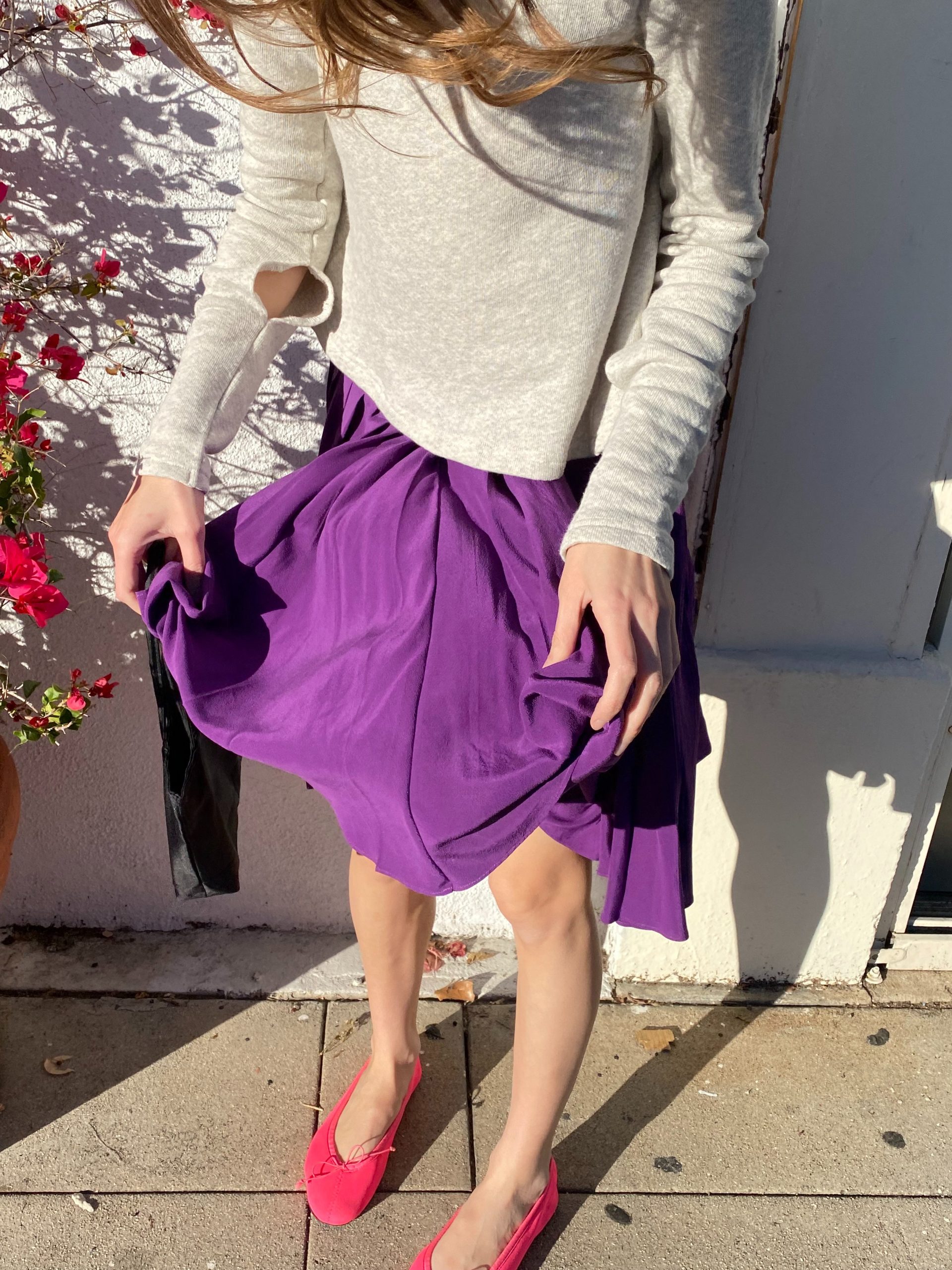 A soft grey sweatshirt with an unexpected twist — an open back tied with an elegant bow, blending casual comfort with a hint of allure. It’s paired with a deep purple pleated silk skirt that moves gracefully with every step. The look feels fresh, youthful, and effortlessly romantic — like a modern take on French-girl charm.